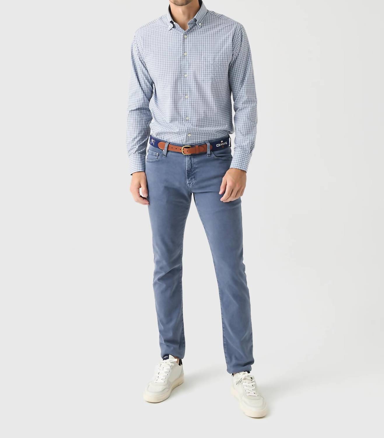 Introducing the Murray Performance Sport Shirt by Peter Millar, a sophisticated men's classic fit shirt in navy. This casual button-down shirt features long sleeves and a button-down collar, designed with a plaid and check pattern. Crafted from 100% polyester, it offers two-way stretch, wicking, and UPF 50+ sun protection, ensuring both comfort and practicality. This shirt is made for easy care with a button closure, and for best results, machine wash cold with like colors and lay flat to dry.