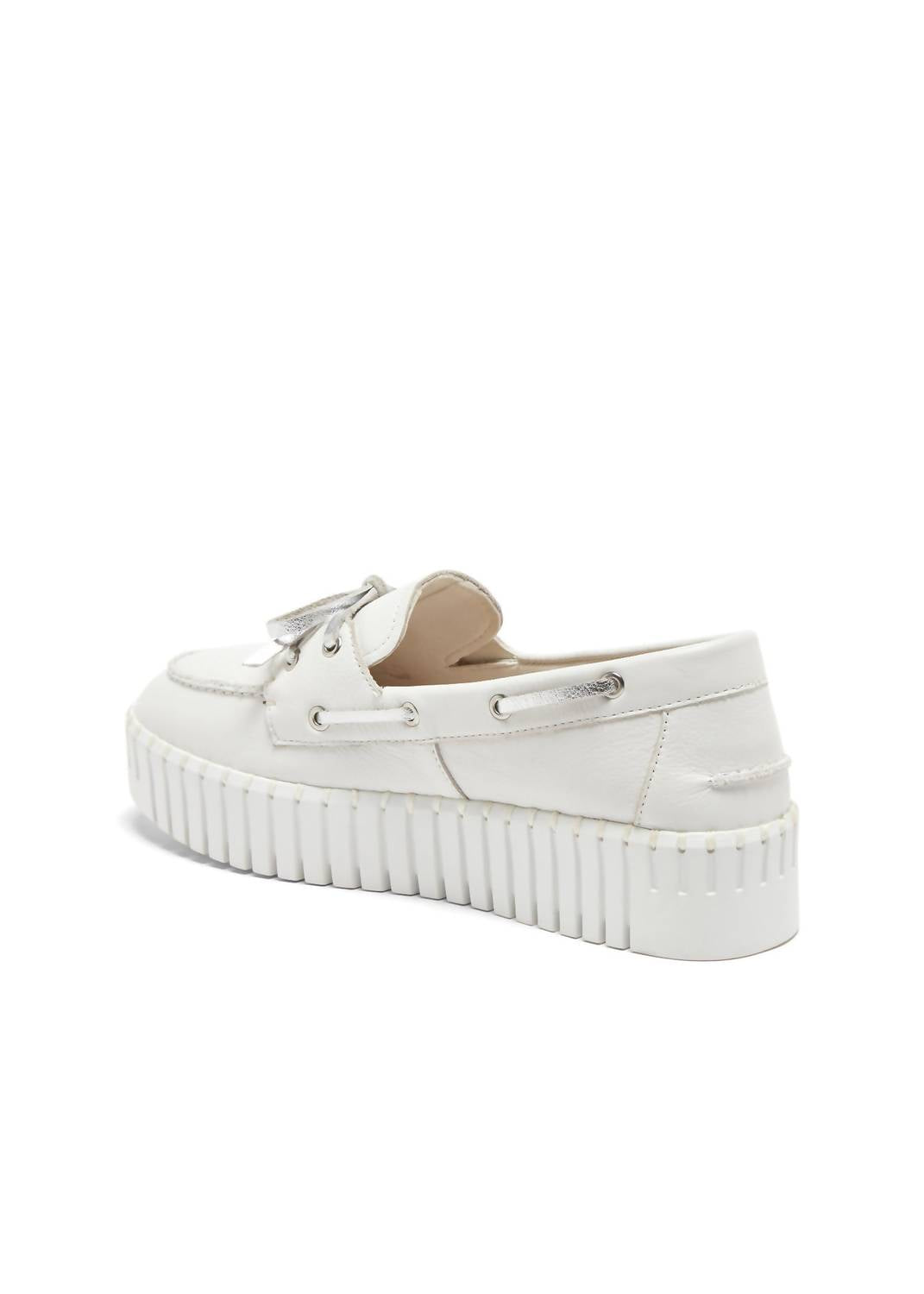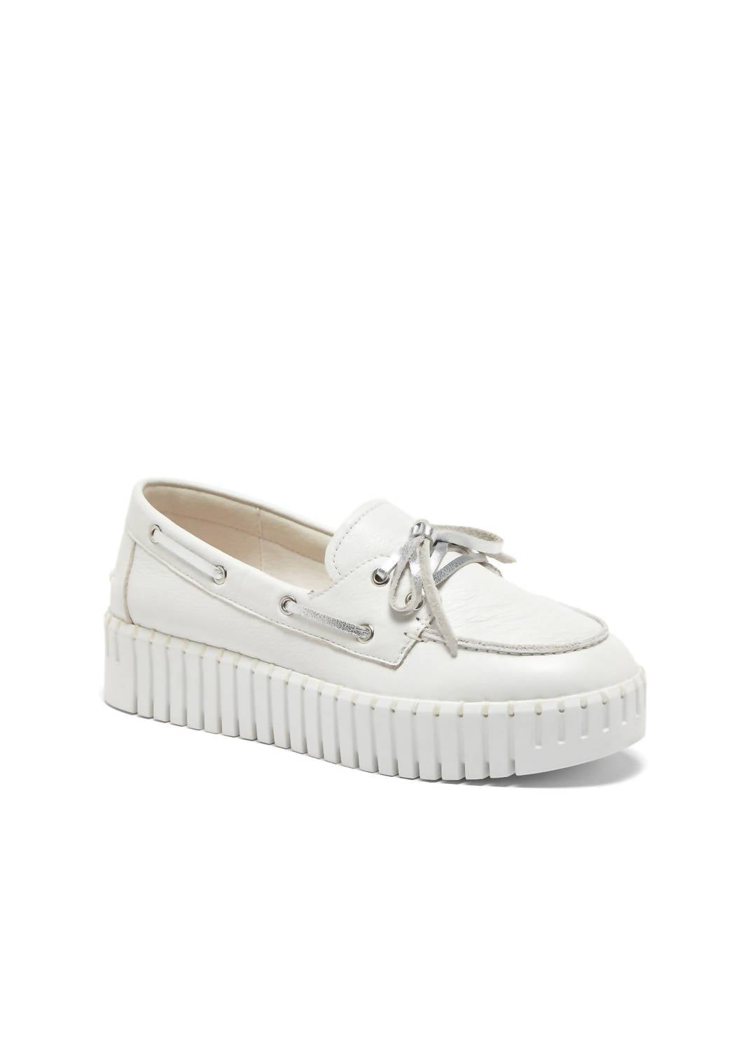 Introducing the Silent D Boat Sneaker, a chic and timeless addition to any wardrobe. Crafted with a leather upper and lining, this shoe promises both durability and a sleek look in a crisp white leather finish. The cushioned footbed ensures all-day comfort, while the rubber sole provides sturdy traction. Featuring a round toe and a platform heel measuring approximately 1.75 inches, these sneakers are perfect for pairing with everything from casual to smart-casual ensembles.