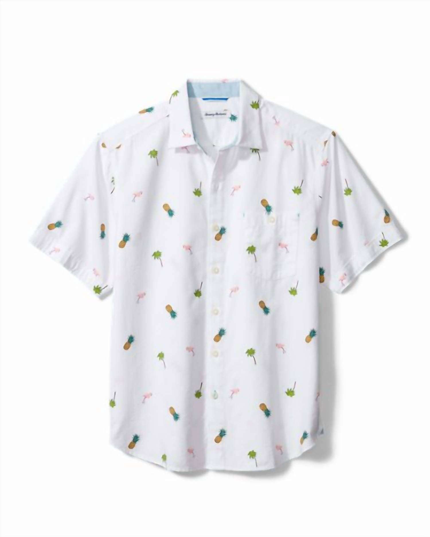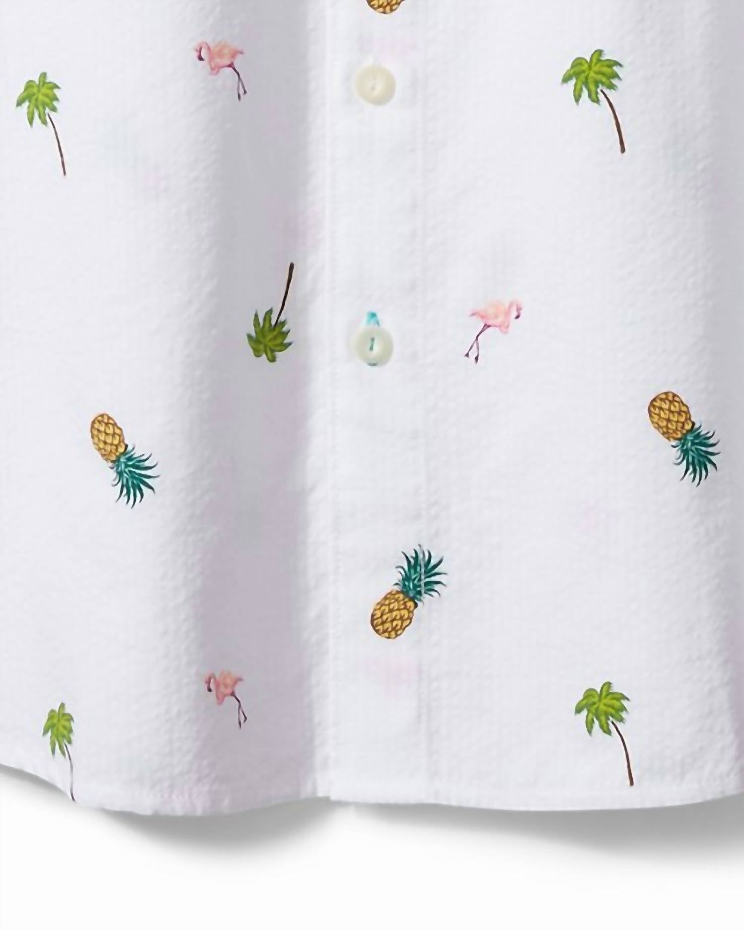 Featuring classic paradise motifs, like the pineapple and flamingo. Craig collar. 5-point button-through patch pocket. Applied sleeve cuffs. Shirttail hem. Side-seam gussets. Machine wash cold.