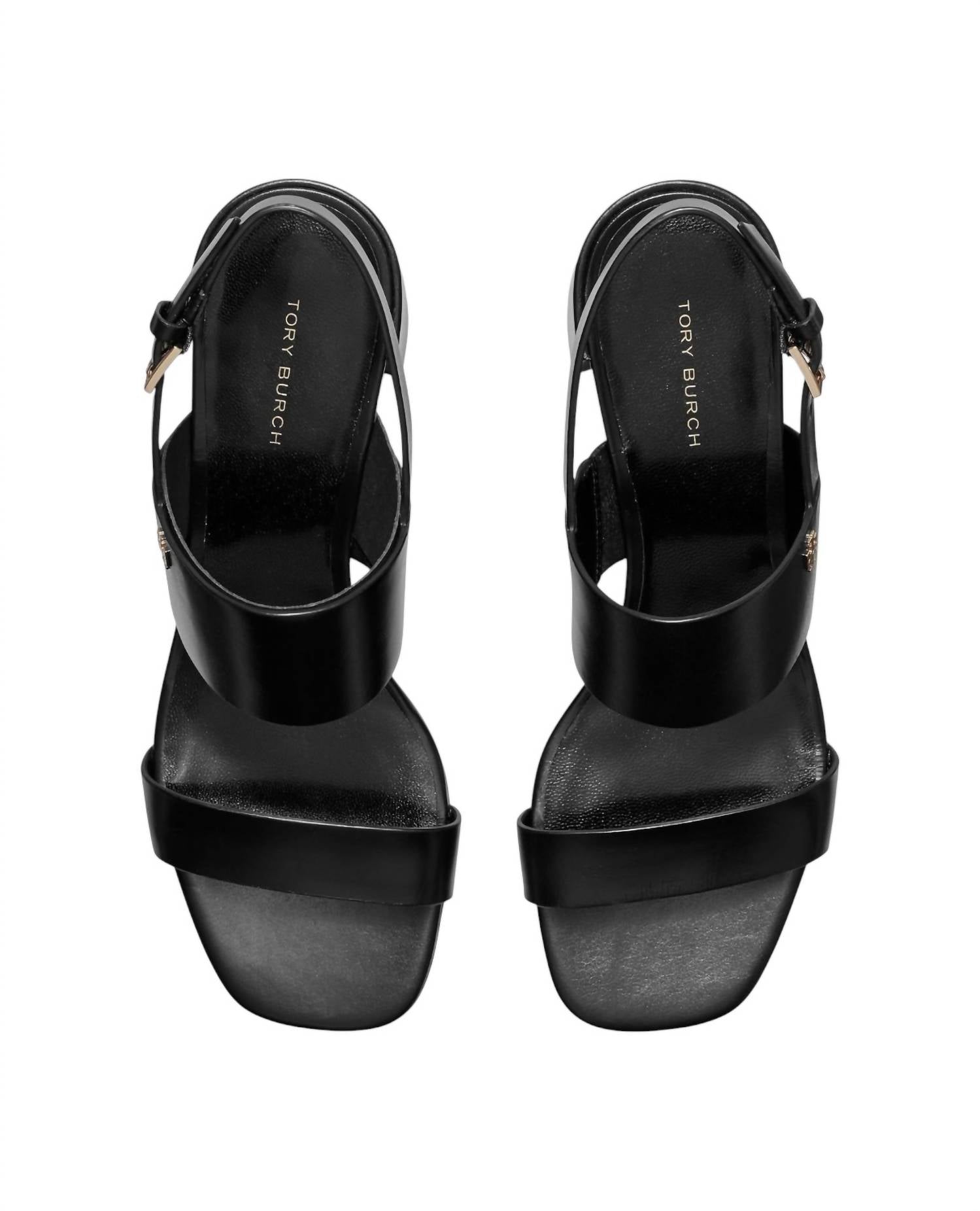 This sandal will take you from brunch to dinner and everything in between. Step into timeless elegance with the Women's Double T Heel Sandals by TORY BURCH. These sandals feature a sleek leather sole and a 2" (50mm) block heel, ensuring both style and comfort. The adjustable buckle slingback strap offers a customizable fit, while the lightly cushioned leather footbed provides additional comfort. Perfect in black, these sandals are a versatile addition to any wardrobe.