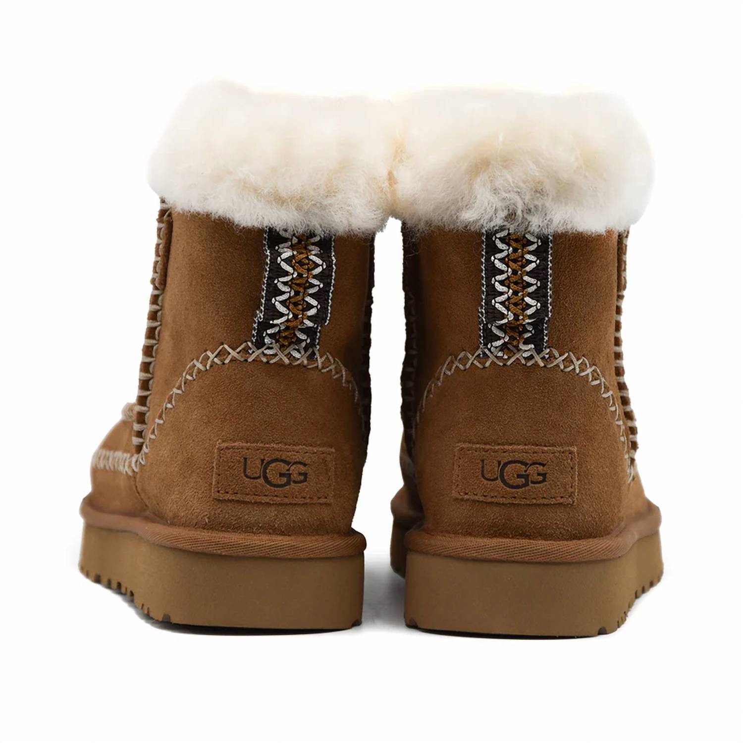 Say hello to the perfect, most versatile boot. The ankle height makes this style easily transition from day to night. Wear them with your favorite skinny jeans and tee for a more laid back look, or pair them with your favorite mini dress and jacket for a night out on the town. Introducing the Women's Classic Mini Alpine Boot by UGG, crafted in a rich chestnut suede for timeless appeal. This boot features a round toe and a 1.25-inch platform heel, offering a sleek and subtle lift. The exposed sheepskin collar, suede mudguard, and decorative stitching encapsulate UGG's iconic design, further enhanced by the fixed leather lace and UGGbraid pull tab. Enjoy superior comfort with a 17mm UGGplush™ lining and a sugarcane EVA outsole, perfect for an ultralight, eco-conscious on-the-foot feel.