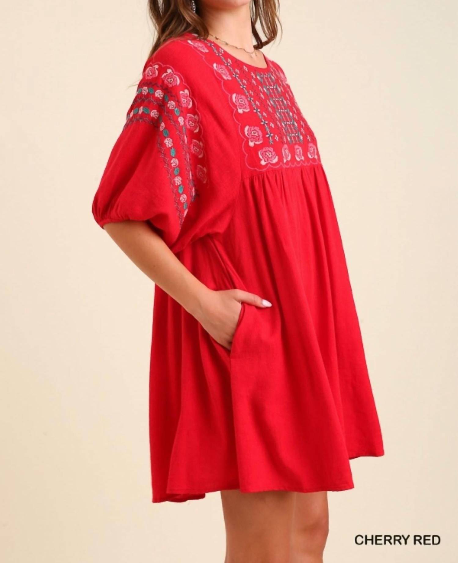 The perfect mini dress for those warmer months. Puff Sleeve. Embroidered Bib And Sleeves. Short Loose-Fitting Dress. Pockets. Non-Lined. True To Size. 55% Linen 45% Rayon.