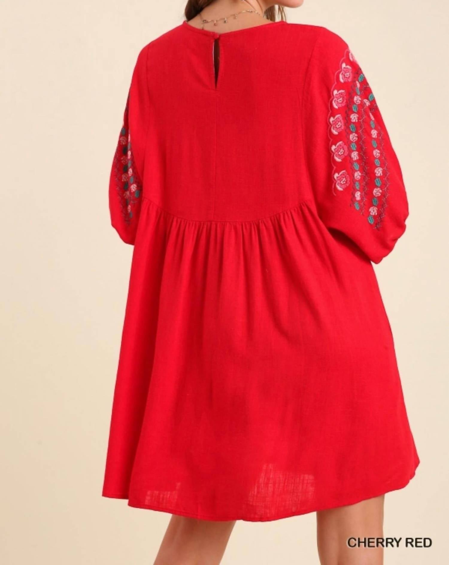 Puff Sleeve. Embroidered Bib And Sleeves. Short Loose-Fitting Dress. Pockets. Non-Lined. True To Size. 55% Linen 45% Rayon.