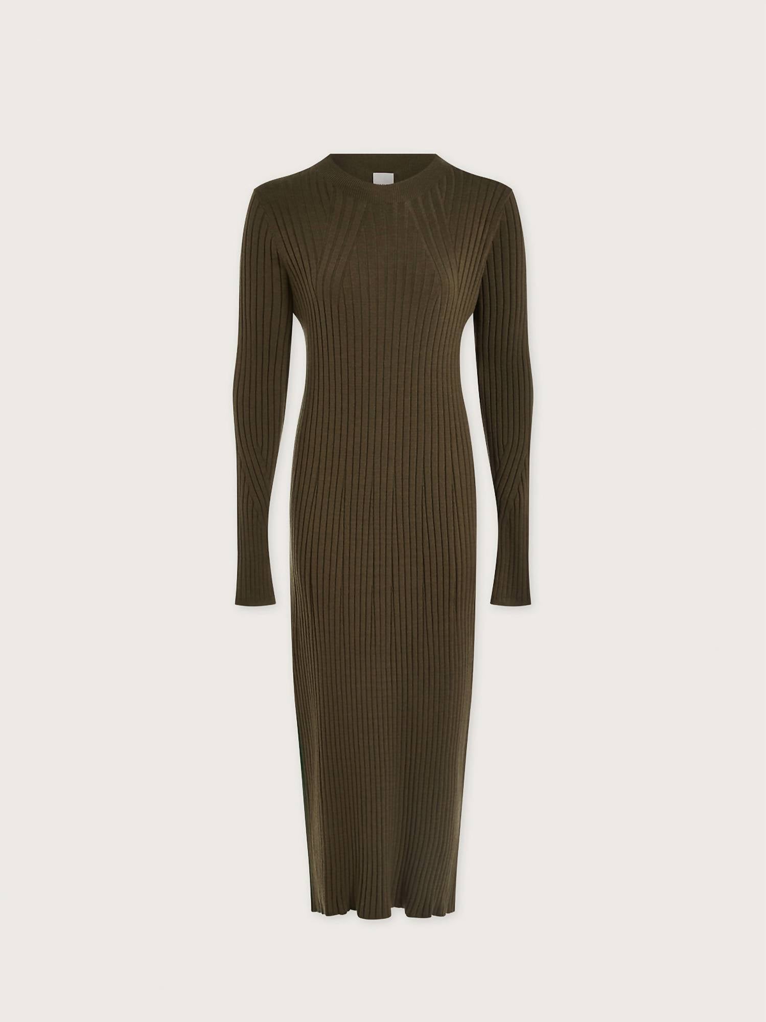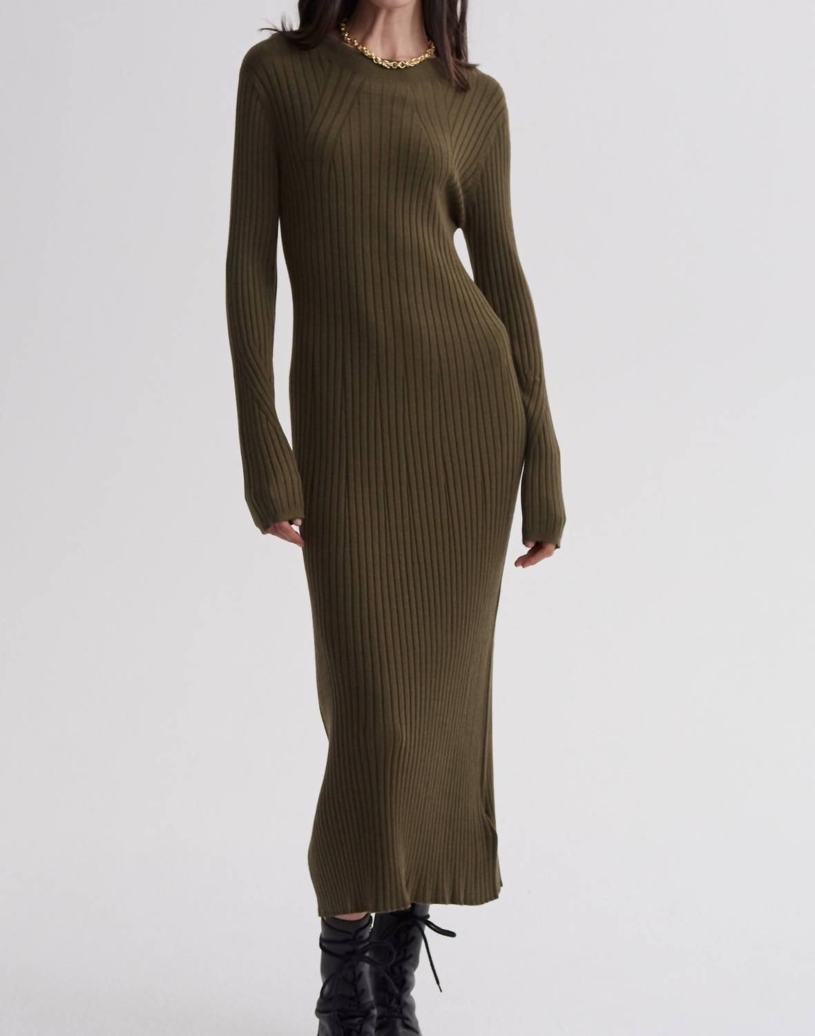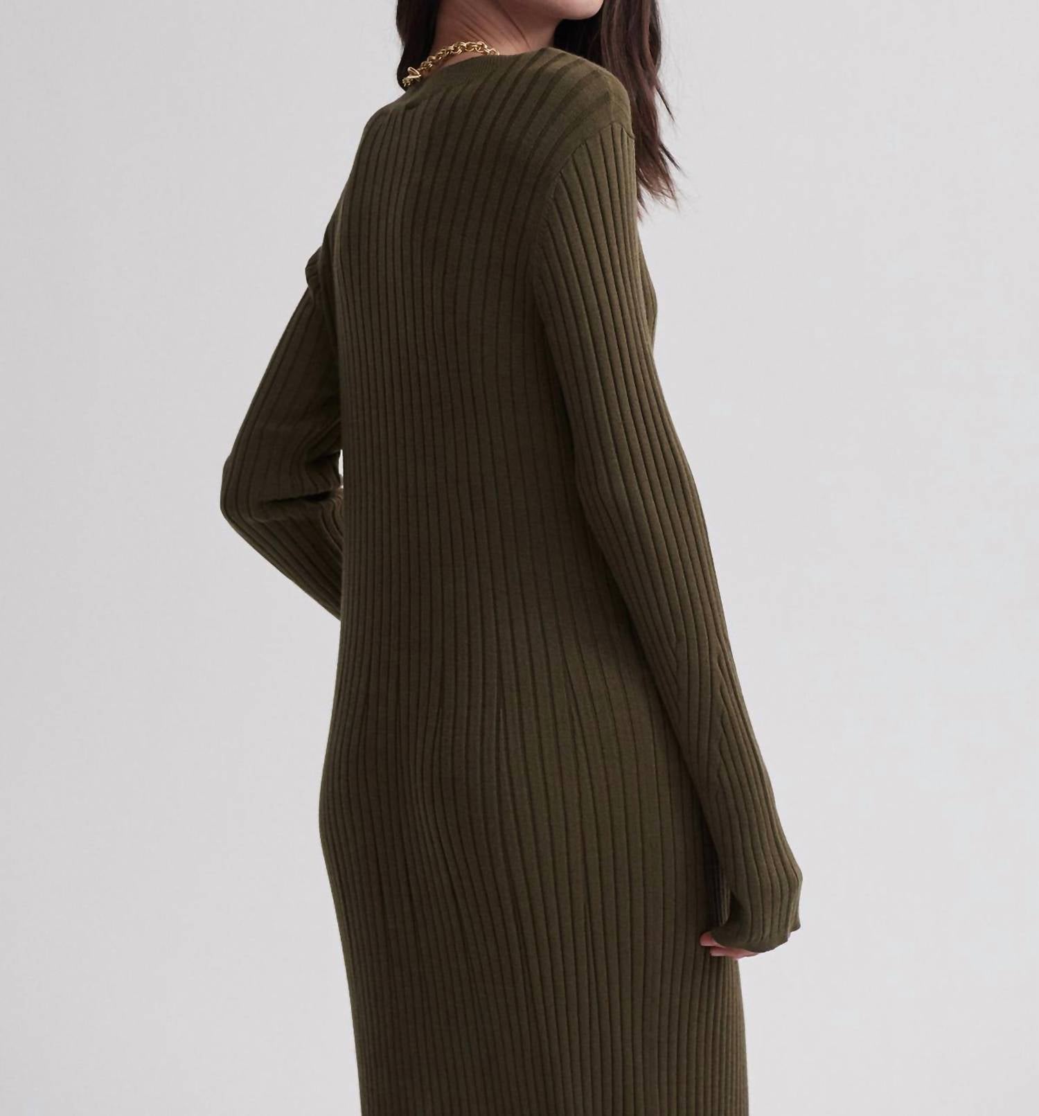 A midi dress so versatile, your options for wearing it are endless. Introducing the Axel Rib Knit Dress by VARLEY, a chic choice in an elegant olive hue, perfect for seamless day-to-night transitions. This dress features a relaxed fit with long sleeves and a classic crew neckline for effortless style. Composition: 50% Viscose, 30% Polyester, 20% Nylon. Care: Machine wash cool, do not bleach, tumble dry, iron on low, dry flat, wash with similar colors, reshape while damp. Size S dimensions: Front Length 48", Sleeve Length 25.7".