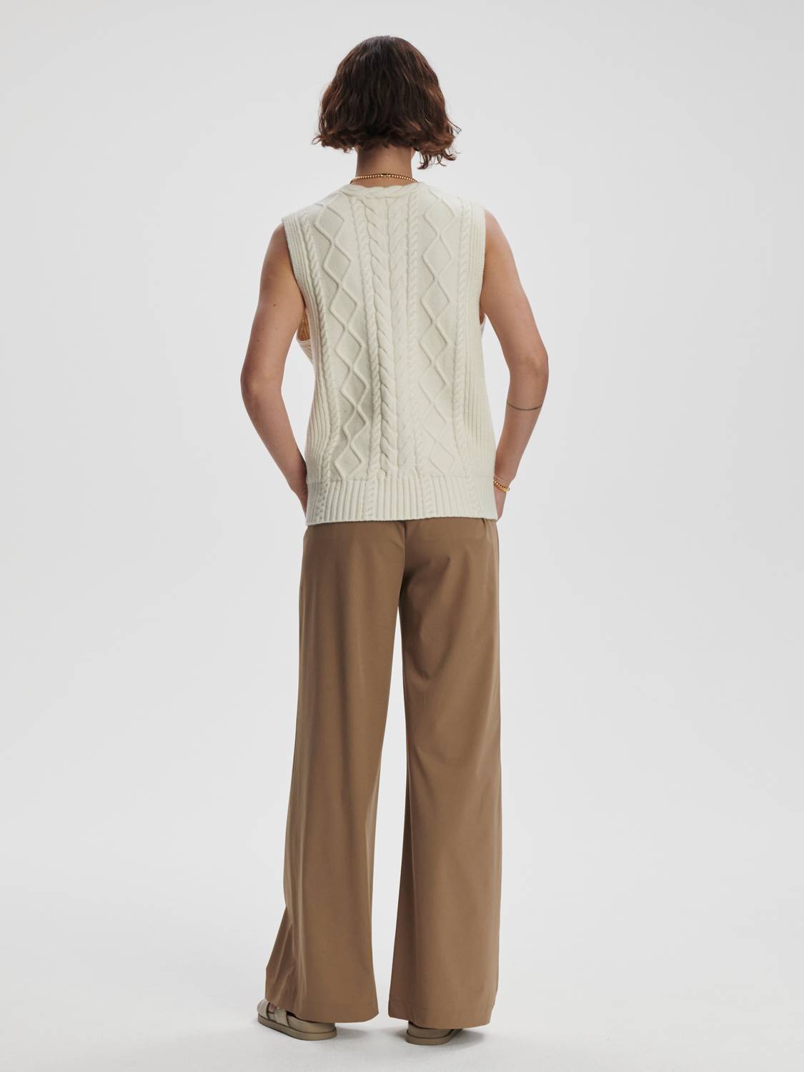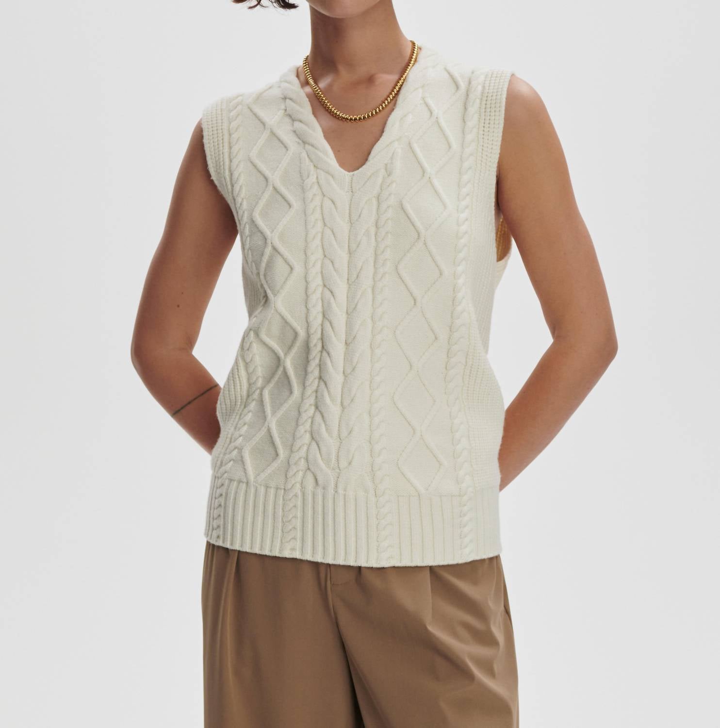Throw this vest over an all black outfit for a perfectly polished look. The Kay Cable Knit Vest by Varley in Snow White is a stylish choice for a textured, medium-weight look. This women's vest is short-sleeved with a V-neckline, offering an effortlessly chic appearance. Crafted from a blend of 50% Viscose, 30% Polyester, and 20% Nylon, it provides comfort and a refined silhouette with its ribbed hem. Made in China, this vest is easy to care for with machine wash instructions.