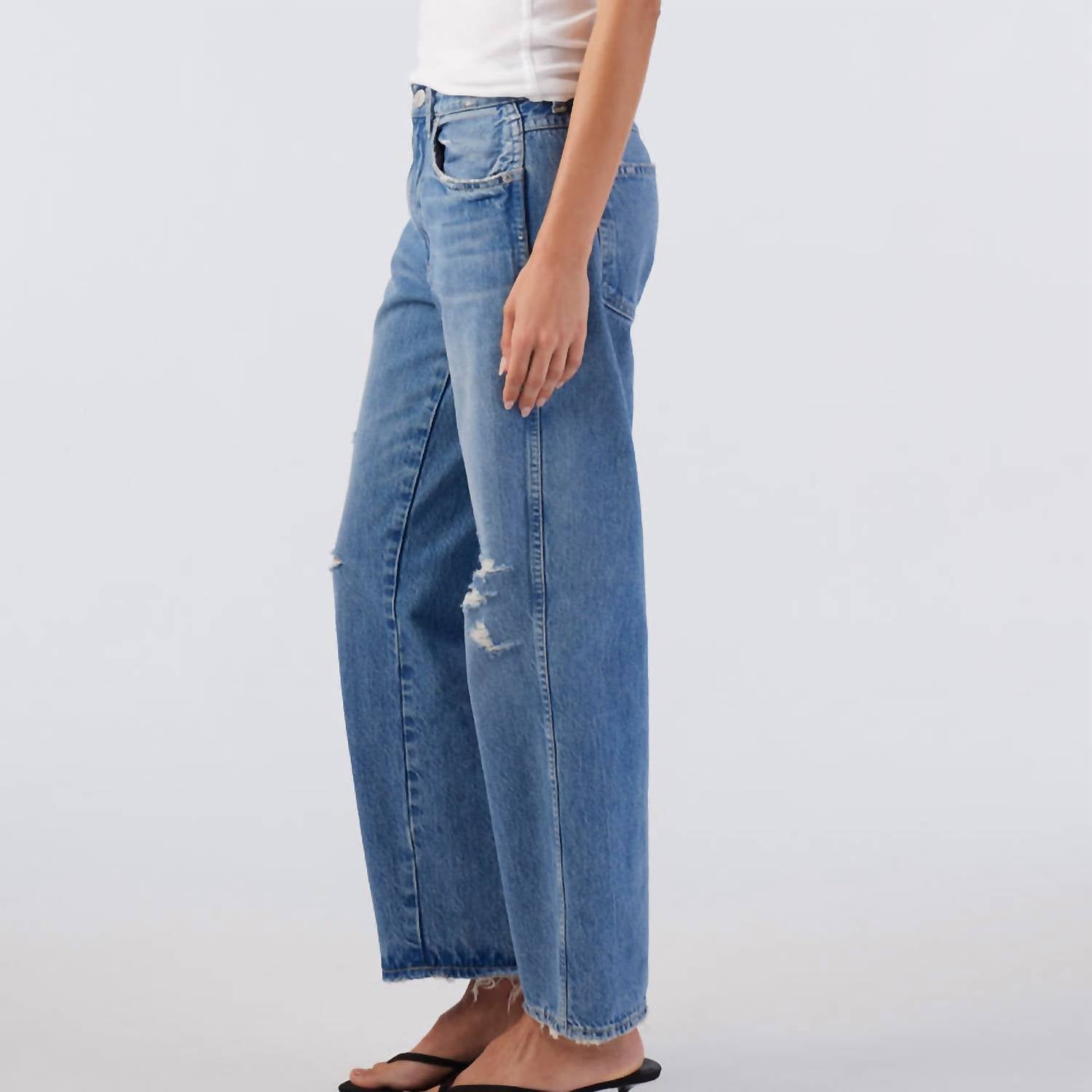 Meet the Women's Billie Jean by AMO, your go-to for effortless style and comfort. These cropped wide-leg jeans are expertly crafted from 100% cotton in a medium blue wash, presenting a relaxed, mid-rise fit that sits low on the hips. Featuring a zip closure and thoughtful distressing throughout, the jeans offer an inseam of 26.5 inches, with a 10 3/4-inch front rise and a 15 1/2-inch back rise, perfect for a laid-back look. Care instructions include machine wash and tumble dry. Model wears size 25 and stands at 5'8.5".