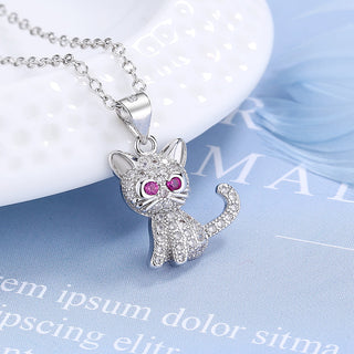 18K White Gold Pink Sapphire Plated Kitty Cat Pendant Necklace
