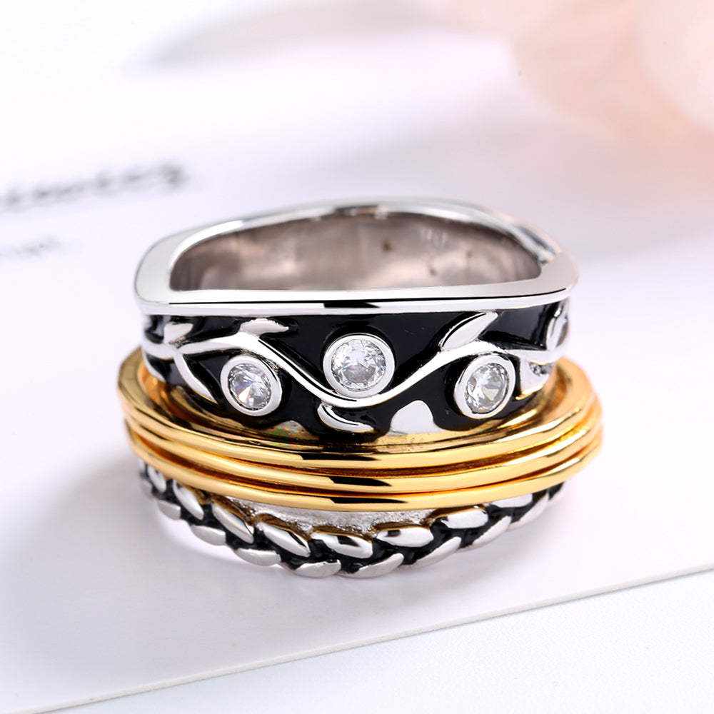 The contrast between the gold and silver portions of the ring is emphasized by the oxidized finish on the silver, which creates a darkened, textured appearance. This adds depth and dimension to the overall design, making it stand out even more.