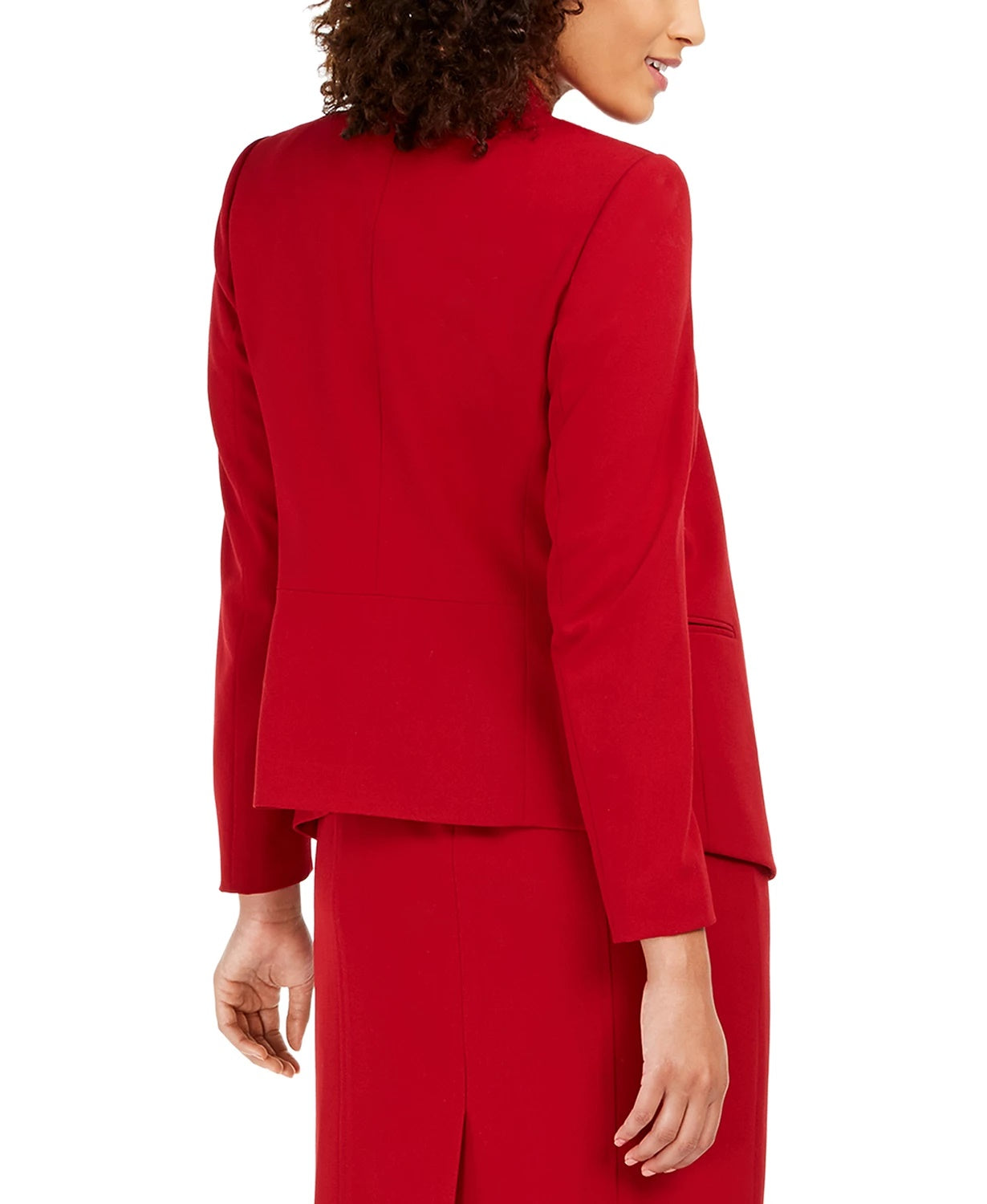 Approx. 23" long from center back to hem|Collarless; open front with no closure|Seamed at back waist for shape; shoulder pads|Welt pockets at waist|Lined|Polyester/viscose/elastane; lining: acetate