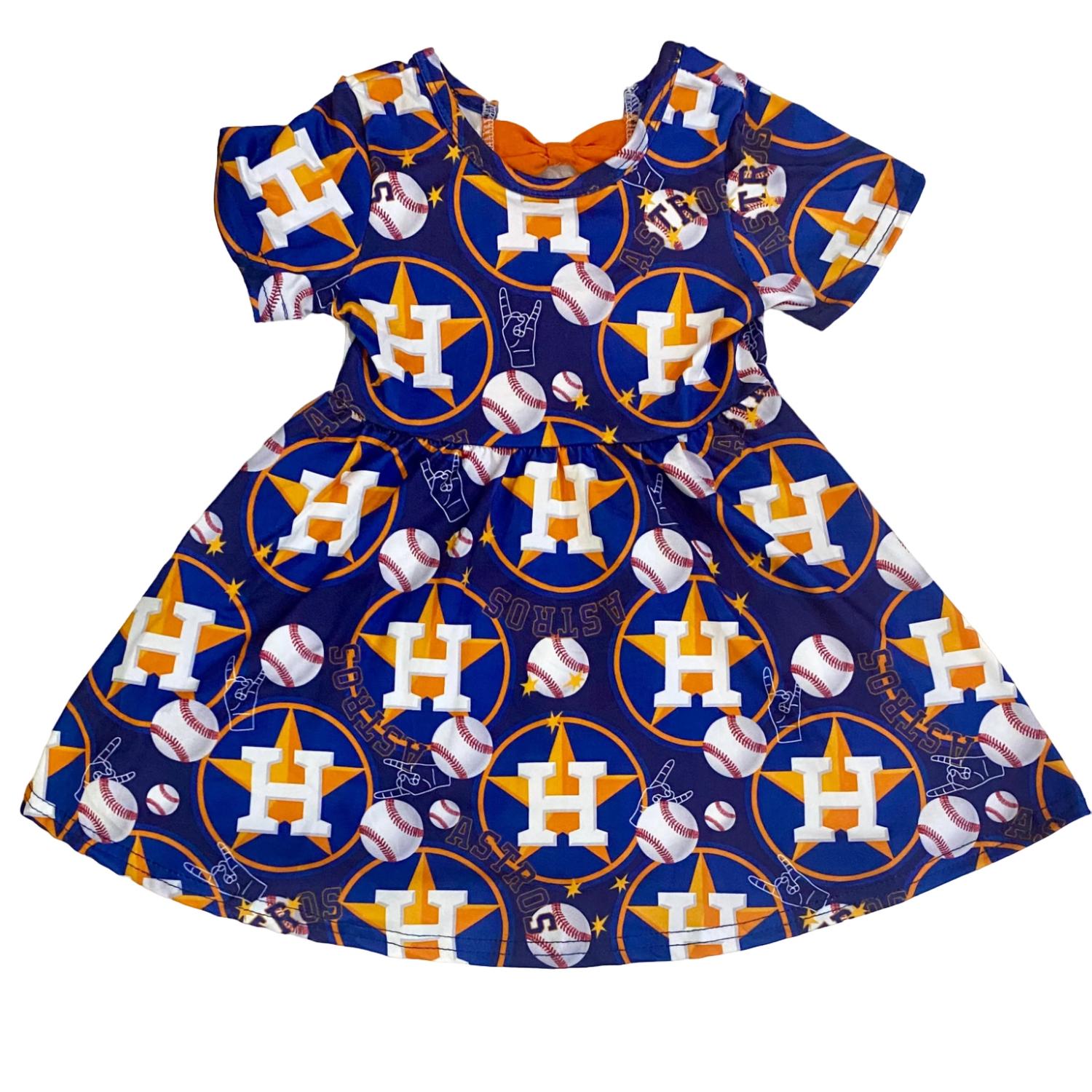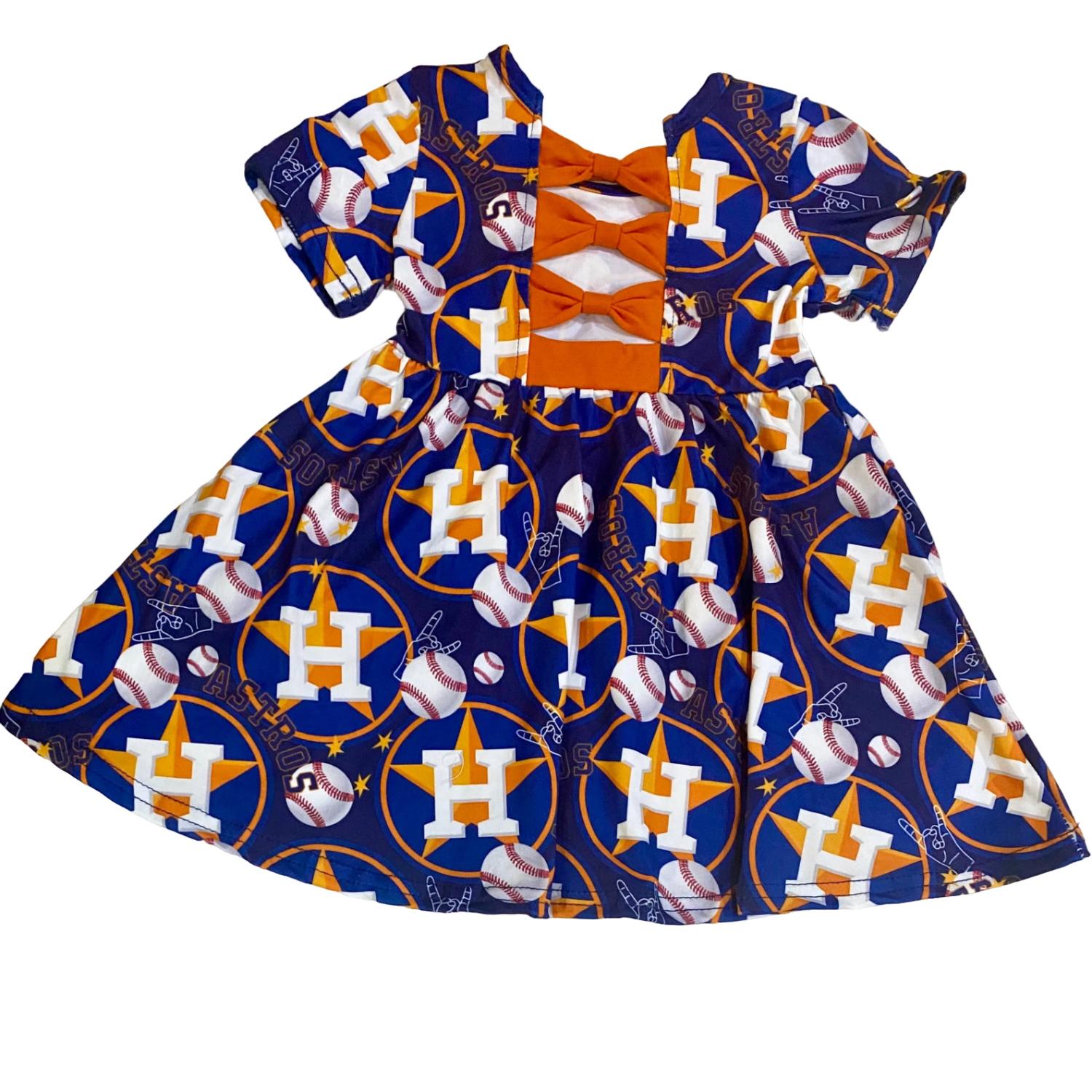 This dress is made from a soft, stretchy blend of 95% cotton and 5% spandex, featuring a charming deep navy pattern and a unique cutout bow on the back for a versatile and stylish look.