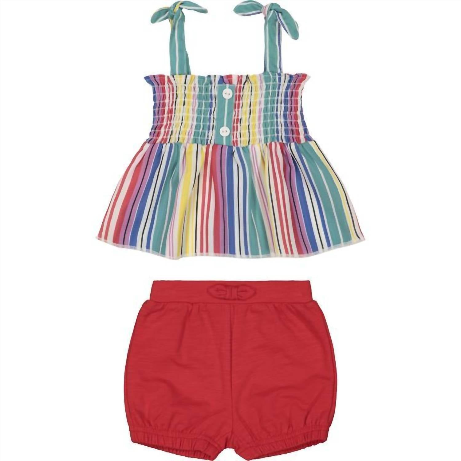 Elevate her wardrobe with the Girl's Rainbow Stripe Tank Set by Andy & Evan, a delightful ensemble bursting with color and style. This tank set features charming bows on the sleeve straps and a stylish shirred top with a two-button detail. Made from 100% polyester, it promises both comfort and vibrancy. Care instructions include machine washing cold, tumble drying on medium, and cool ironing if needed. Perfectly paired with coordinated red bubble shorts for a complete look. Imported for global flair.
