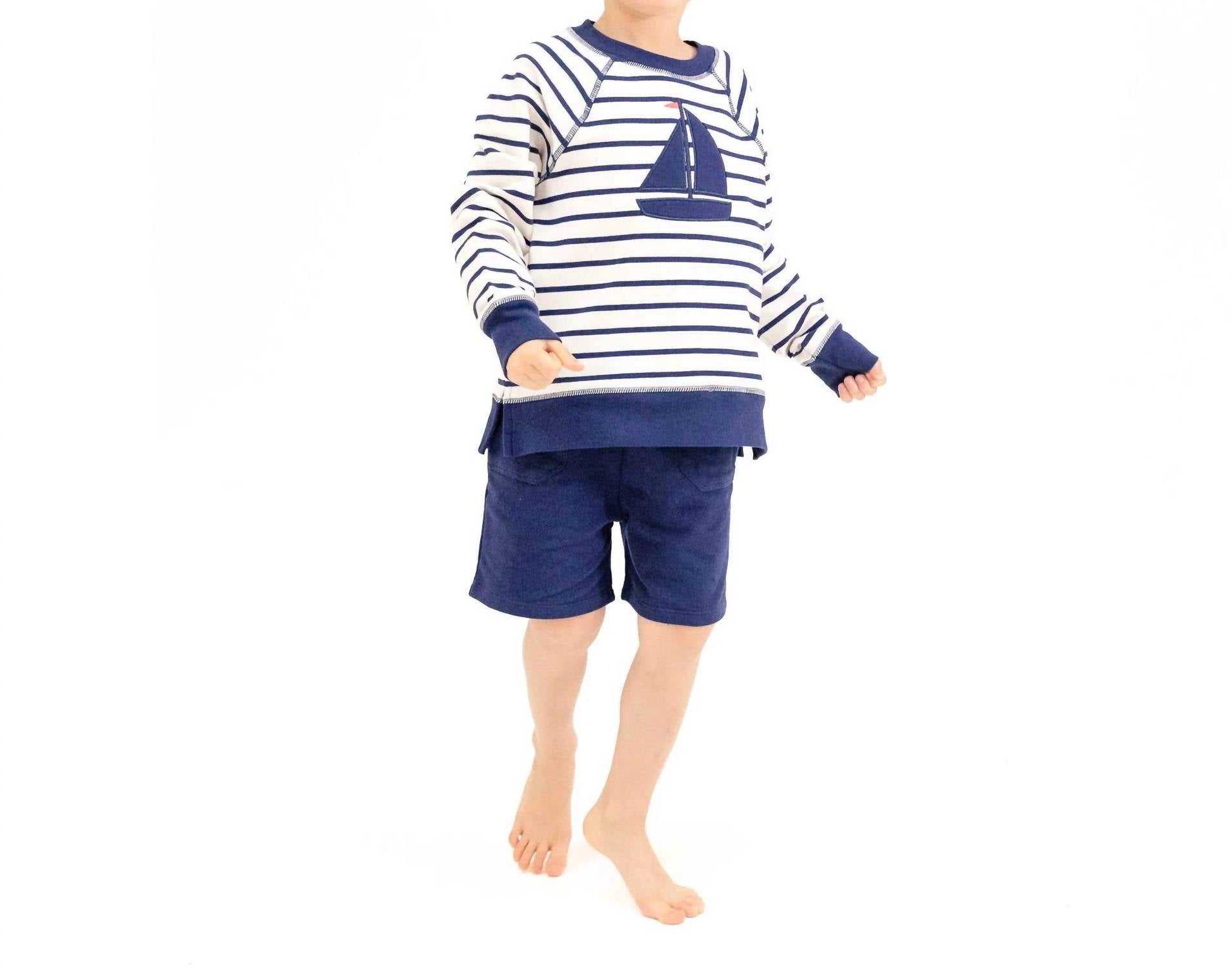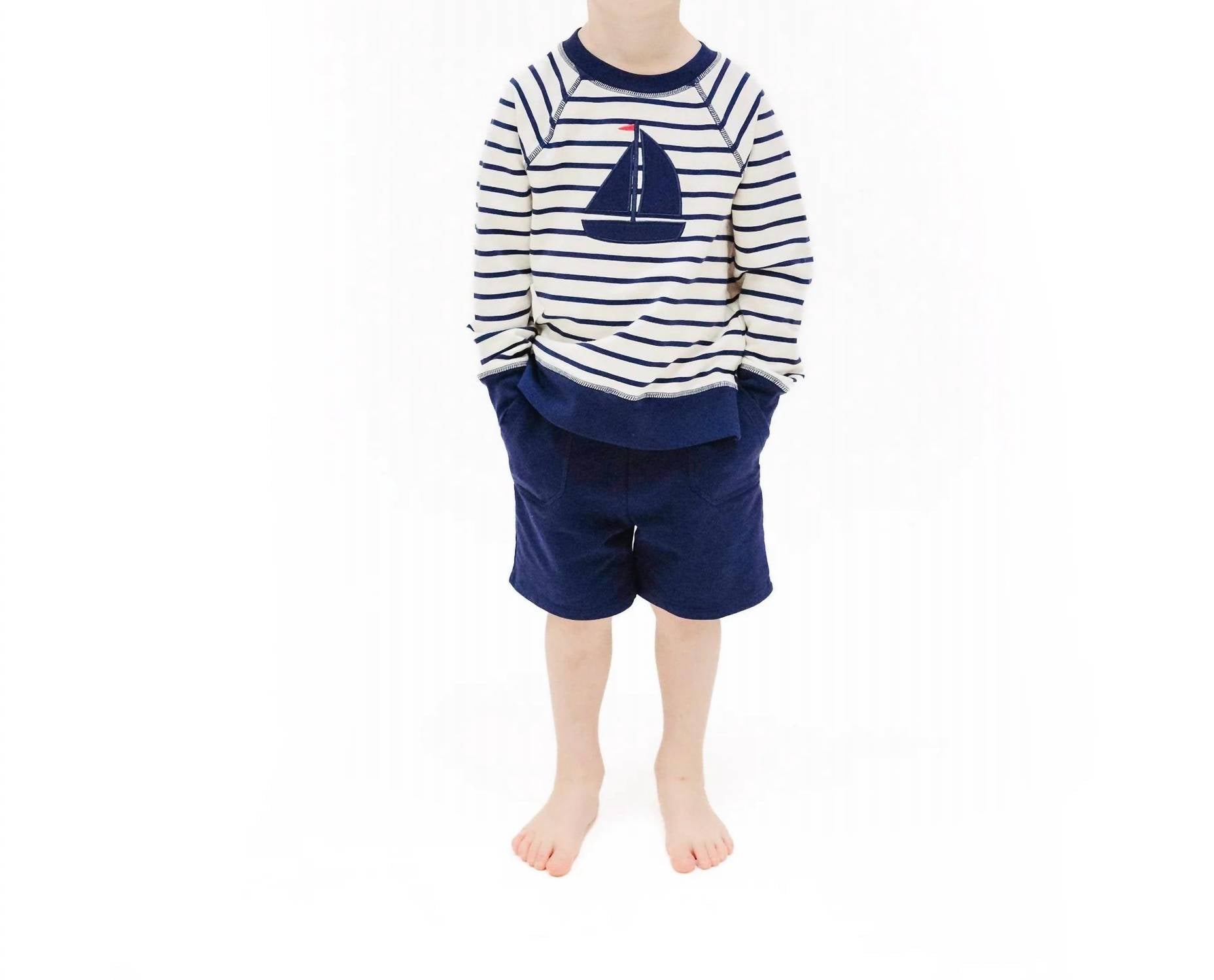 The Stripe Terry Sweatshirt And Short Set by Angel Dear brings a touch of nautical charm with its sailboat applique. Crafted from a comfortable cotton blend of 95% organic cotton and 5% spandex, this navy set is perfect for playdates and sunny adventures. Easy care instructions recommend washing cold and either tumble drying low or hanging to dry, ensuring convenience and longevity. Ideal for any little adventurer looking to sail into fun in style.