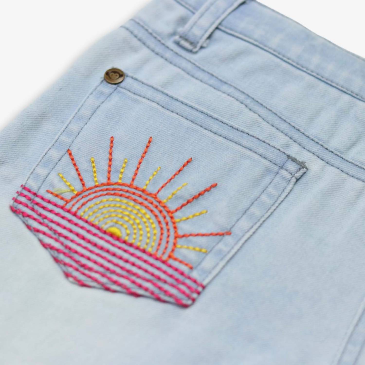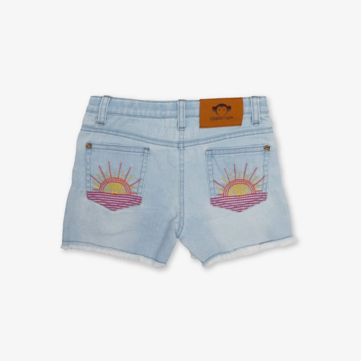 Introduce your little one to summer adventures with the Girls Rhodes Denim Shorts by Appaman. These charming shorts are made from a cotton blend and feature a playful stitched sun detail in a delightful sun wash shade. Composition: 71.5% Cotton, 27.2% Polyester, 1.3% Spandex. Imported. Care: Machine wash cold with similar colors, tumble dry low, medium iron. Perfect for vacation fun, these shorts are a stylish addition to any young girl's wardrobe.
