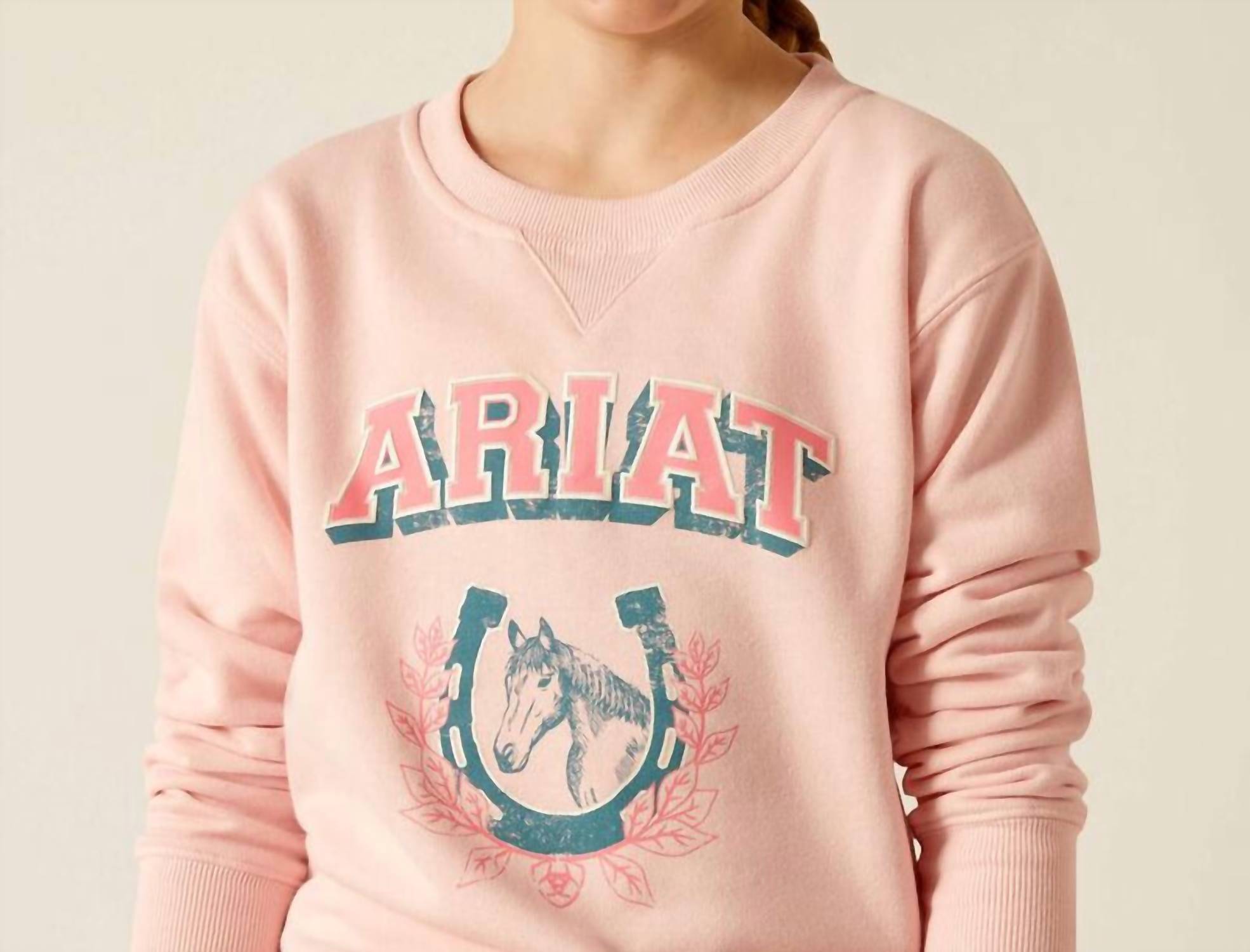 Introducing the Youth College Sweatshirt by ARIAT, a delightful pink garment perfect for your child's back-to-school wardrobe. Crafted from a soft cotton blend, this sweatshirt features a collegiate-inspired screen print detail. Material composition includes 52% cotton and 48% polyester for optimal comfort. Care instructions recommend machine washing to keep it looking fresh and ready for any occasion.