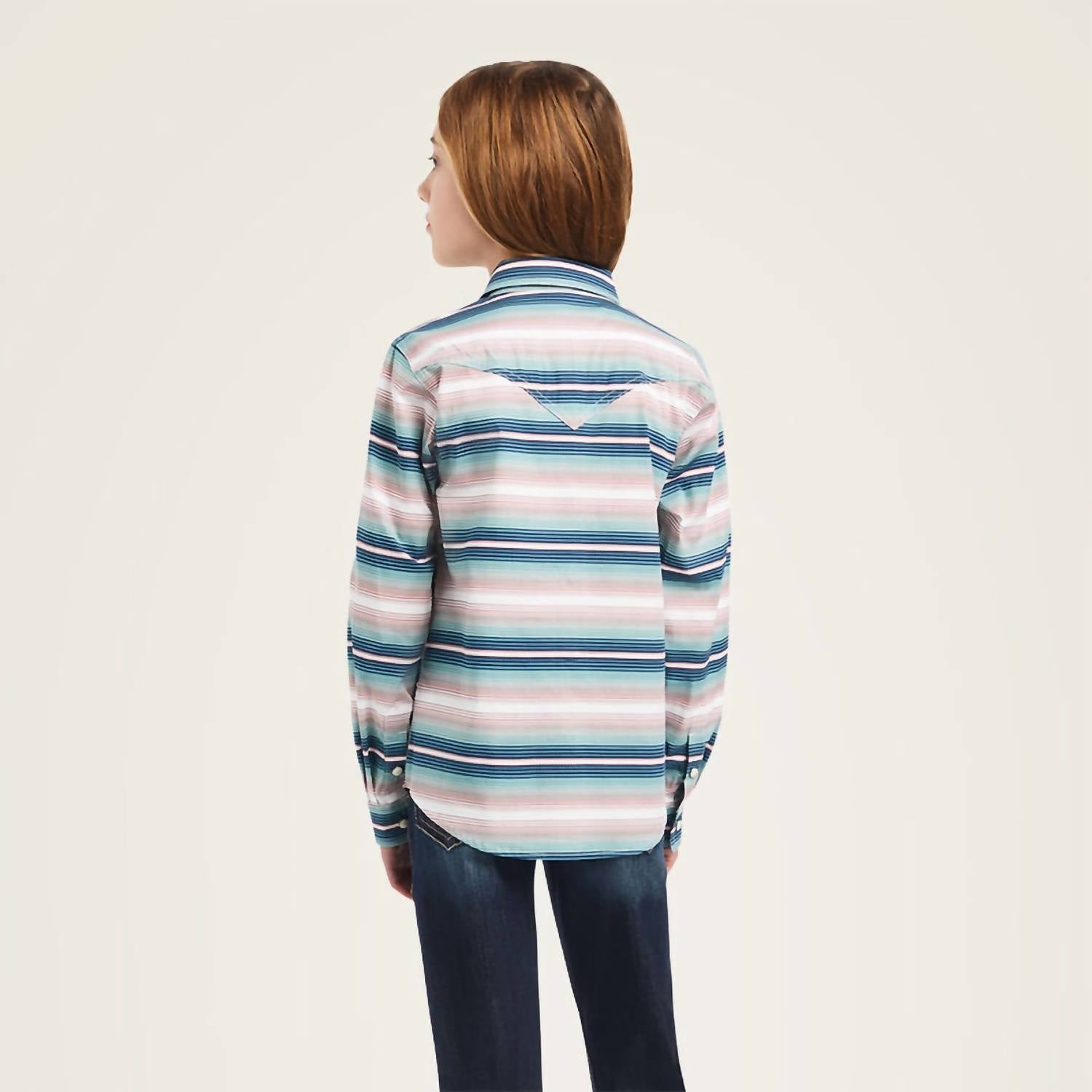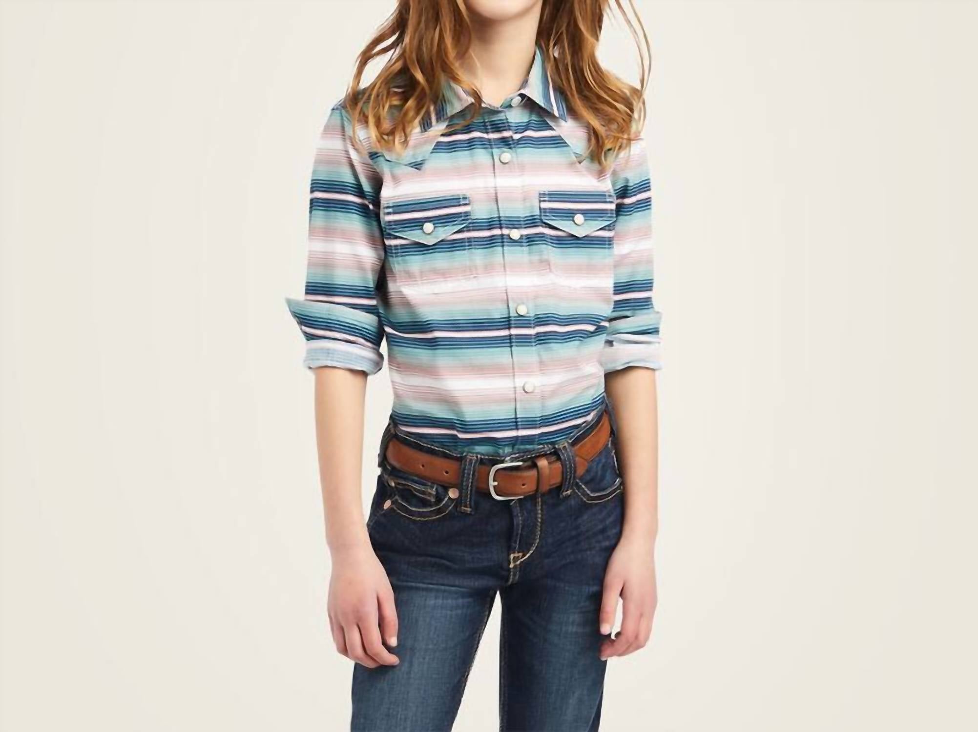 Introducing the Ariat Youth Downstream Shirt, a stylish option for girls mixing Western flair with a cool ombre stripe pattern. Crafted from a comfortable blend of 96% cotton and 4% spandex in 50s poplin fabric, this shirt offers both durability and softness. It features functional chest pockets and is ideal for various occasions, from school days to barn visits. Care is simple with machine washing for easy maintenance.