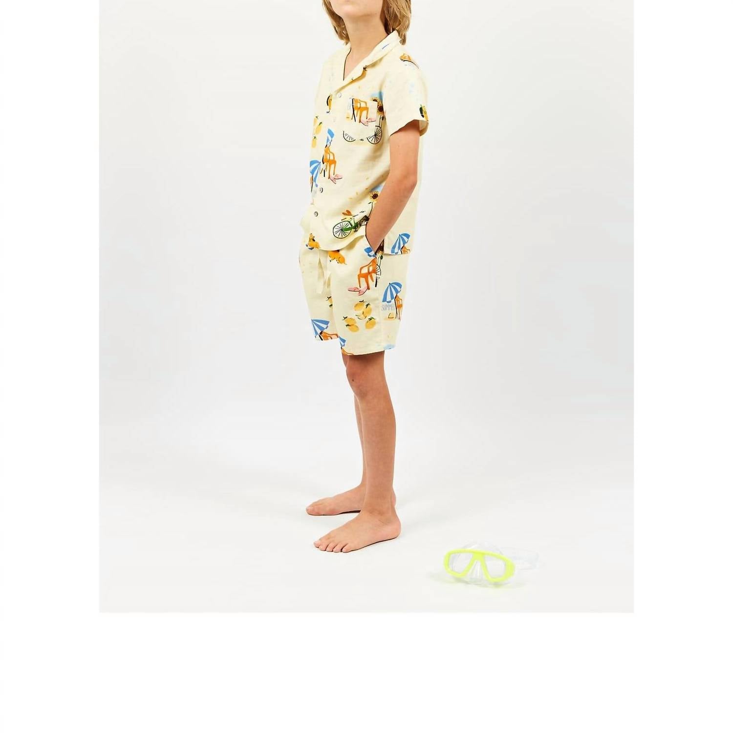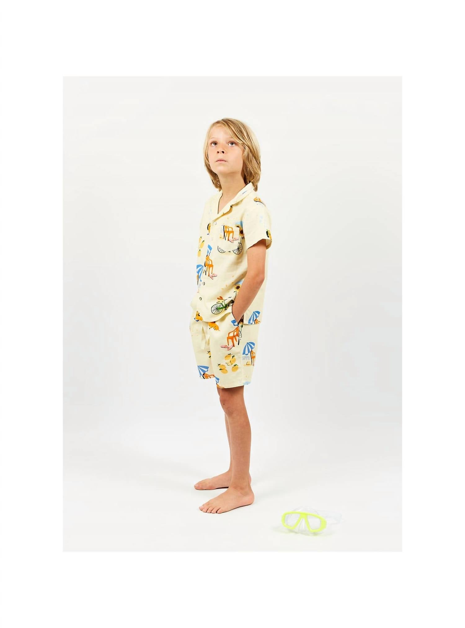 Introducing the Kid's Boy Bermuda Summer Shorts by Arsene et les Pipelettes, a vibrant yellow pair crafted for the little adventurer. Made from durable yet breathable twill, these shorts boast a playful graphic pattern perfect for adding a pop of color to your child's summer wardrobe. Featuring an elasticated waistband with a drawstring for a secure fit, along with convenient slit pockets and a stylish welt pocket at the back. Care is a breeze with machine wash and tumble dry instructions, making them a practical choice for active boys.