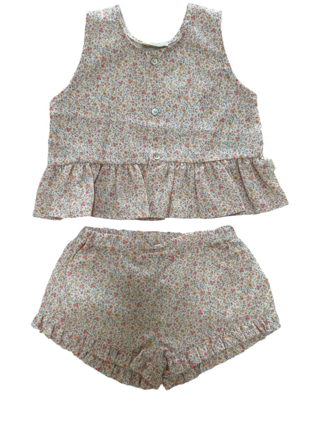 Introducing the Kid's Girls Meadow Short and Blouse Set by Baby Gi, a charming addition to your child's wardrobe in a delightful multi-color meadow flower pattern. The blouse features button adornments for easy dressing, while the matching shorts provide adjustable comfort with side buttons. Expertly crafted in Portugal, this set combines style and practicality for everyday wear. Ideal for warmer days, it ensures a comfortable and adorable look.