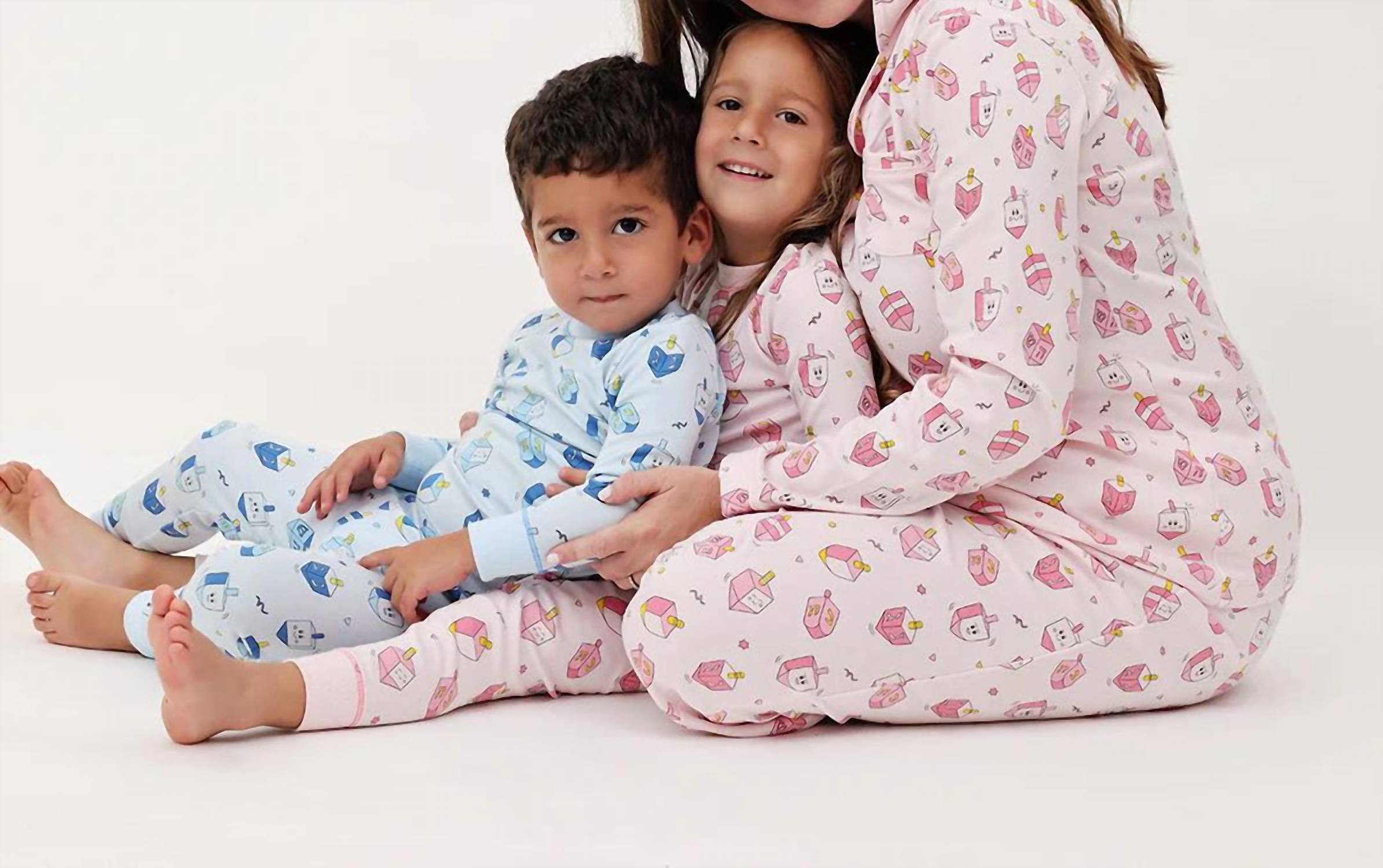 Delight your toddler with the Baby Noomie Hanukkah Dreidels Pajama Set, a cozy and playful addition to bedtime festivities. This set features long sleeves with blue stitch trim and includes a fitted bottom, crafted from 100% soft, breathable, and hypoallergenic Pima cotton. The adorable blue dreidel print adds a festive touch, while the thoughtful shoulder snap design for sizes 12-18 and 18-24 months ensures practicality. Made for easy care, these pajamas are machine washable and tumble dry friendly, perfect for snuggles during Hanukkah.