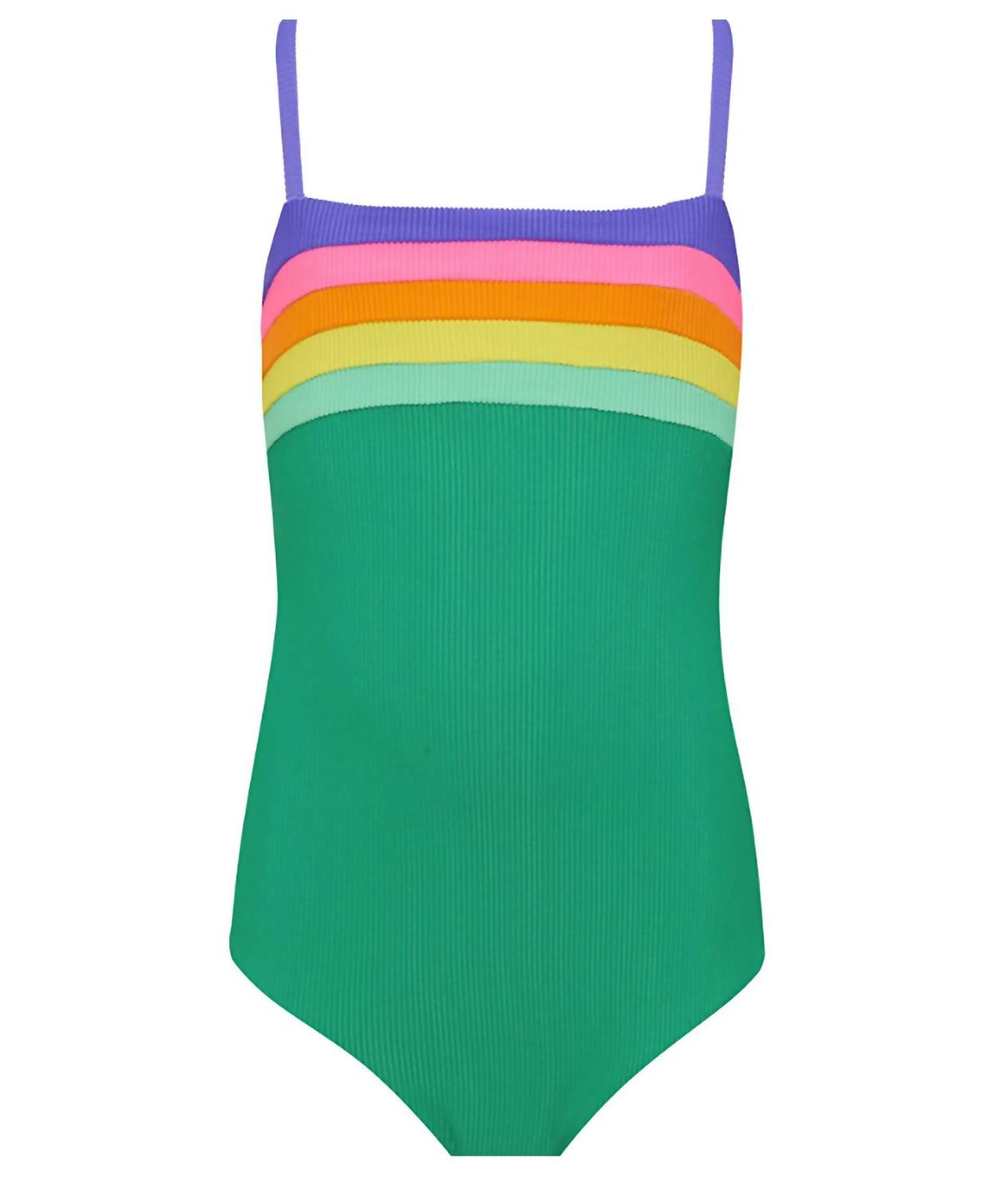 Transform your summer beach day style with the Beach Riot Girls Jessa One-piece Swimsuit in Technicolor Green. This vibrant one-piece swimsuit features a striking stripe pattern, ensuring you'll stand out on the sand. Designed for comfort and confidence, it's a stylish athleisure choice suited for sunny adventures. Care instructions include machine washing and line drying for easy maintenance.