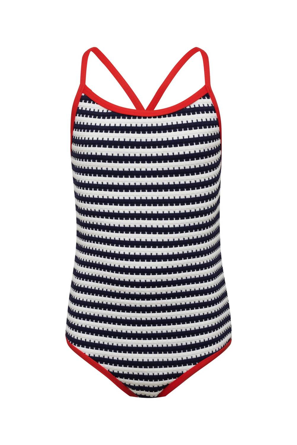 Introducing the Kid's Little Julia One Piece by Beach Riot, a chic swimsuit perfect for a sunny beach day. This stylish piece in Indigo Midnight color features a stripe pattern and is crafted from a Viscose Blend composed of 53% Viscose and 47% Nylon. It offers a pull-on style with crossed back straps, ideal for easy wear and a secure fit. Care instructions recommend hand washing and laying flat to dry, ensuring lasting quality for many summer adventures.