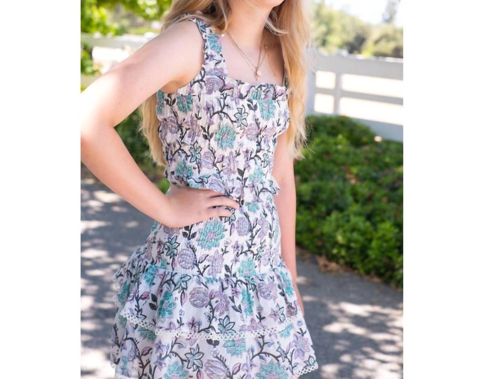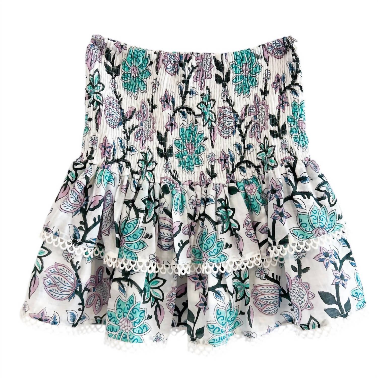 Embrace the spirit of spring with the Melanie Skirt by Bell by Alicia Bell, beautifully crafted in a vibrant turquoise floral pattern. This girl's mini skirt, complete with a smocked drop waist and double ruffle detailing, ensures a playful boho chic look. Material: 100% Cotton. Closure: Pull-on. Care: Machine wash, tumble dry. Perfect for Easter celebrations or a sun-filled vacation.