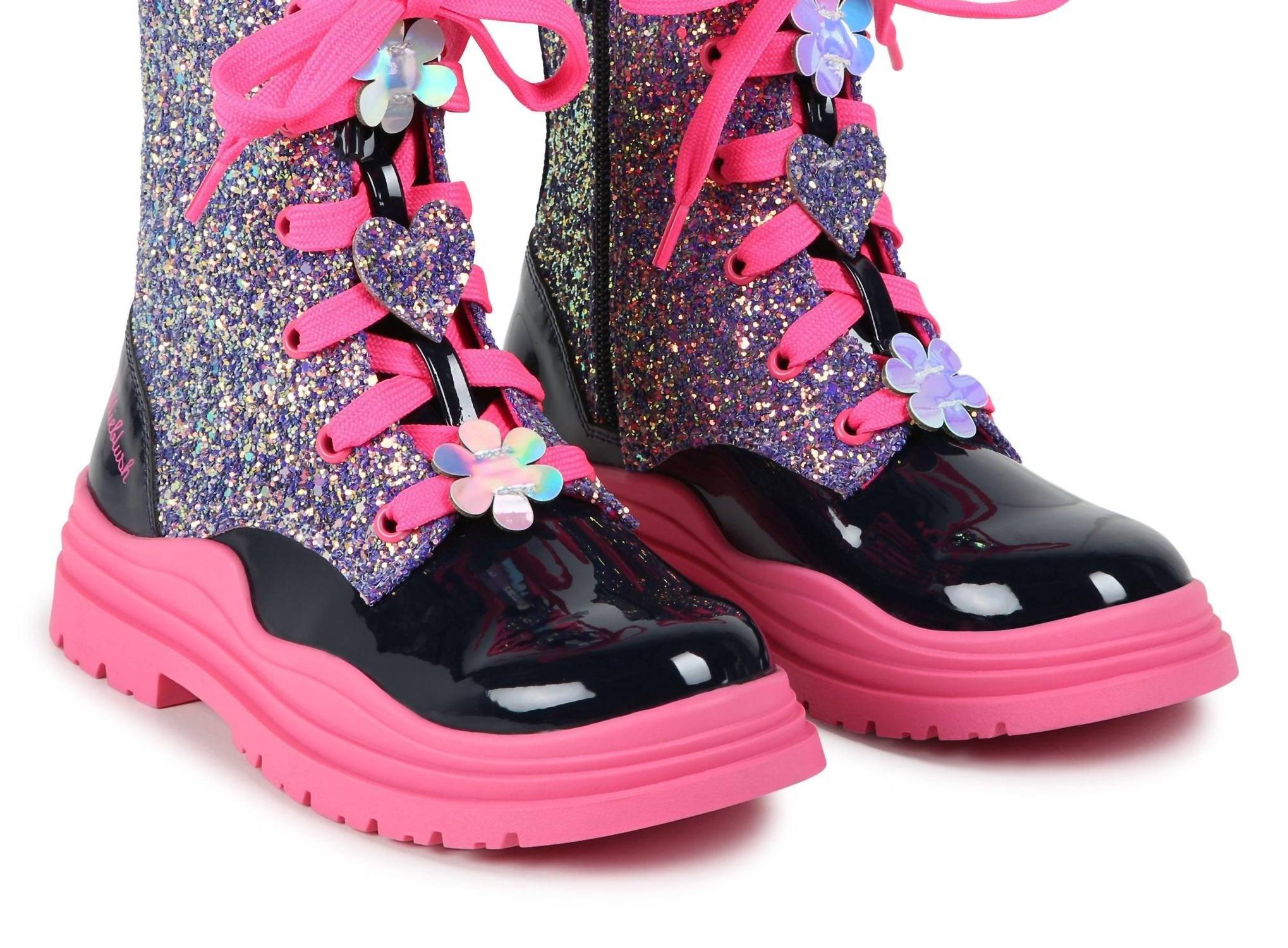 Introducing the Glitter Boots With Flower Laces by Billieblush, perfect for adding a sparkle to any girl's wardrobe. These eye-catching boots feature vibrant navy and pink glitter side panels, with neon pink lace fastenings and a chunky, non-slip sole. The boots are made from 100% textile, with a lining of 100% leather and an outsole of 100% synthetic material, ensuring both style and comfort. They are designed with a convenient side zip fastening and a cute, detachable iridescent flower appliqué on the laces, complete with a grosgrain heel loop.