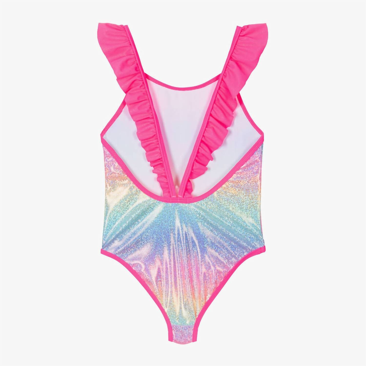 Introducing the Girls Glitter Swimsuit by Billieblush, a vibrant summer essential in a multi-color with an iridescent effect. This one-piece features sleeveless thin shoulder straps, a stylish V-back, and charming ruffled trim for added flair. Composed of 85% Polyester and 15% Elastane, it's designed for a comfortable fit with a slip-on style and full lining. Care: Machine wash. Perfect for beach days and summer holidays.