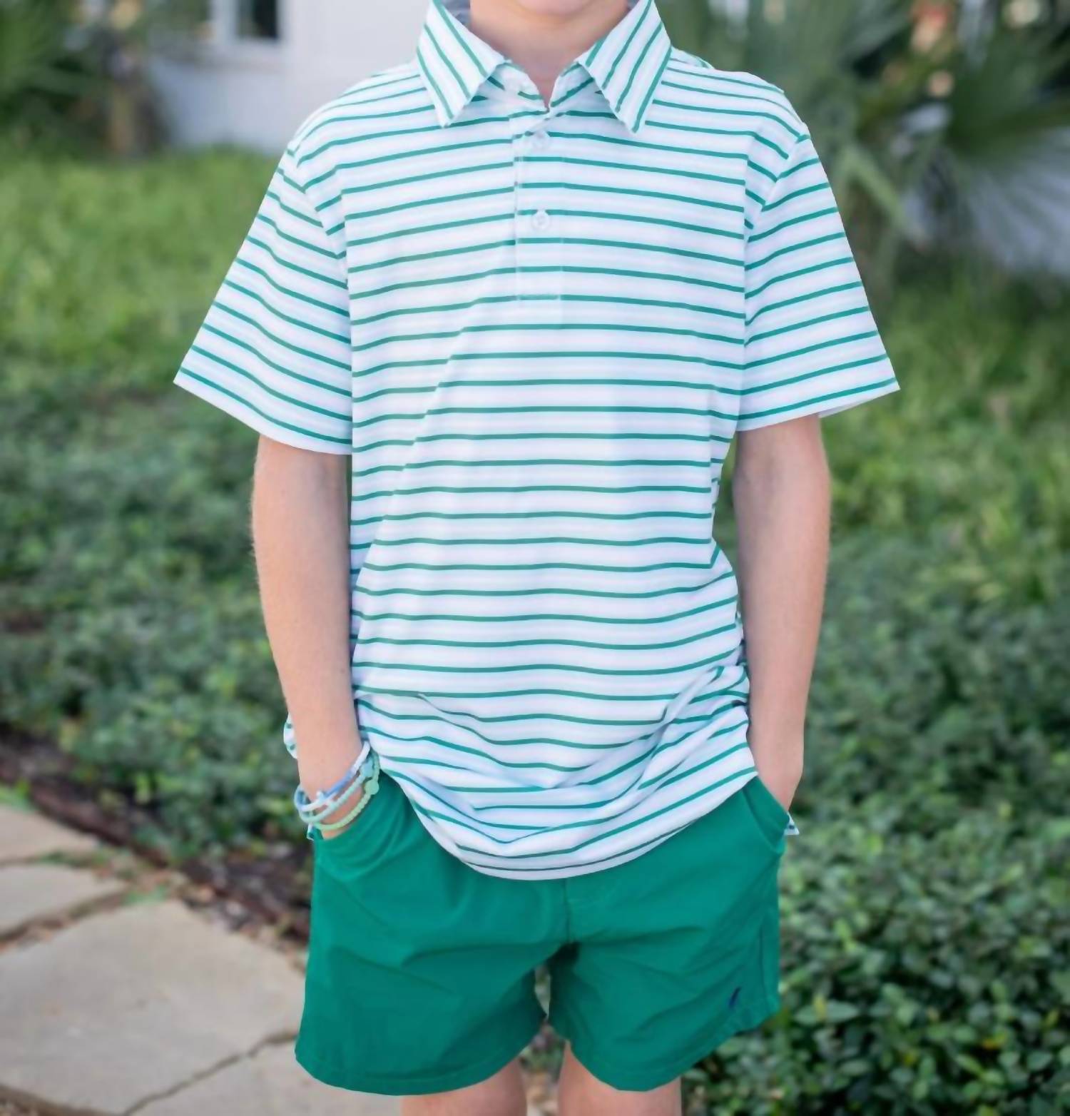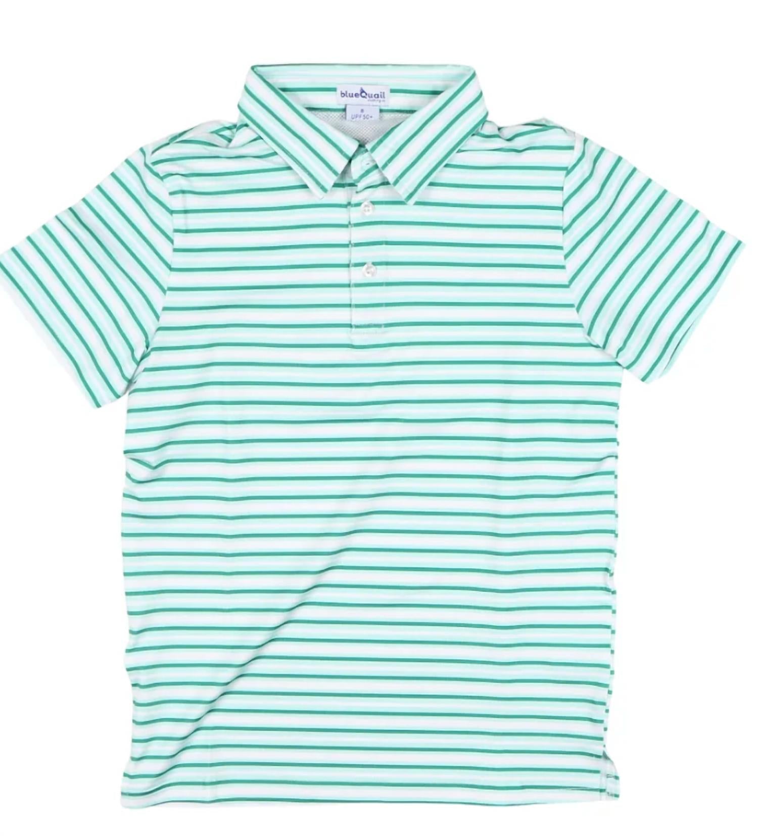 The Boy's Polo Shirt by Blue Quail Clothing Co. is designed for both style and functionality, featuring short sleeves and a breathable mesh-vented design. Made from 85% Polyester and 15% Spandex, it offers UPF 50+ protection and a buttery-soft feel in a striking Emerald Stripe. Perfect for hot summer days, this lightweight polo is both quick-drying and resistant to stains and wrinkles. For easy care, simply machine wash and tumble dry.