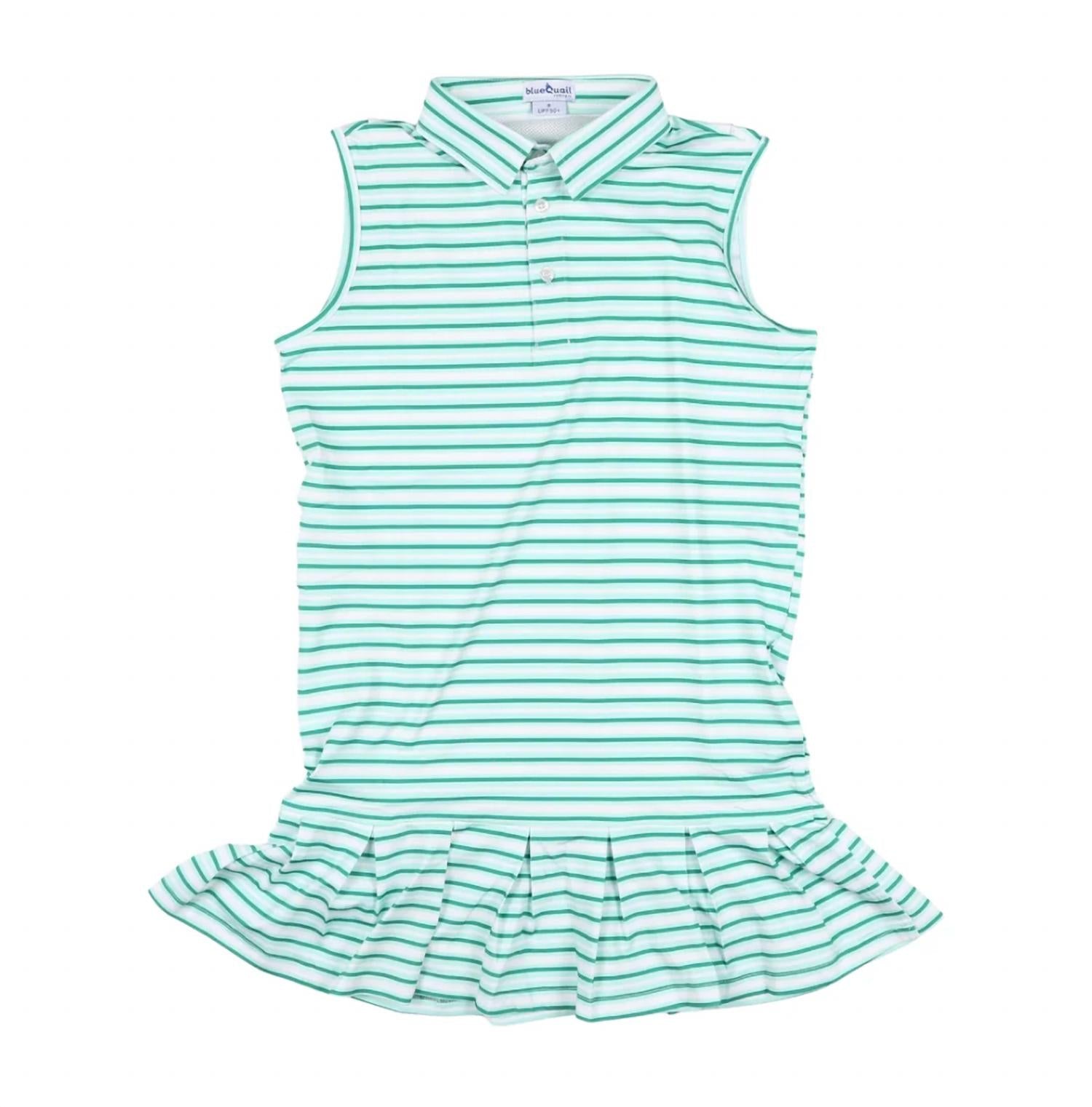 Introducing the Girl's Polo Dress by Blue Quail Clothing Co., perfect for vacations with its stylish and protective design in an Emerald Stripe pattern. This sleeveless dress ensures comfort with its lightweight and mesh-vented fabric, featuring a composition of 85% Polyester and 15% Spandex. Designed with UPF 50+ for UV protection, it is also quick-drying, stain-resistant, and wrinkle-resistant. Care: Machine wash and tumble dry.