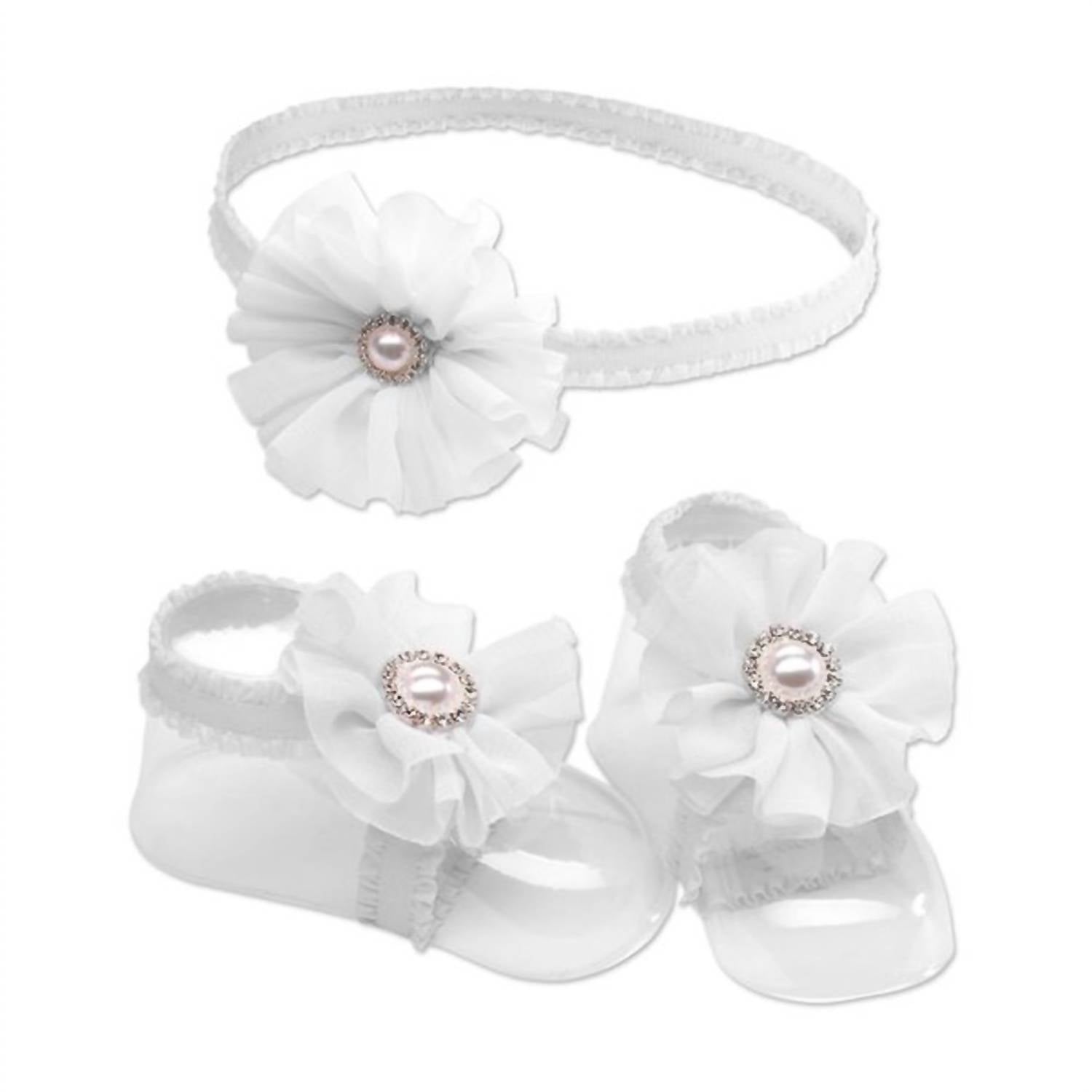 These barefoot sandals, from Cherished Moments, feature soft, white flowers that are bejeweled in the center with a touch of bling and sparkle. The matching headband is simply precious as well. Flower is on soft, stretchy band for baby's comfort. A lovely accessory for baby's Christening or after Christening. It completes any outfit just beautifully.