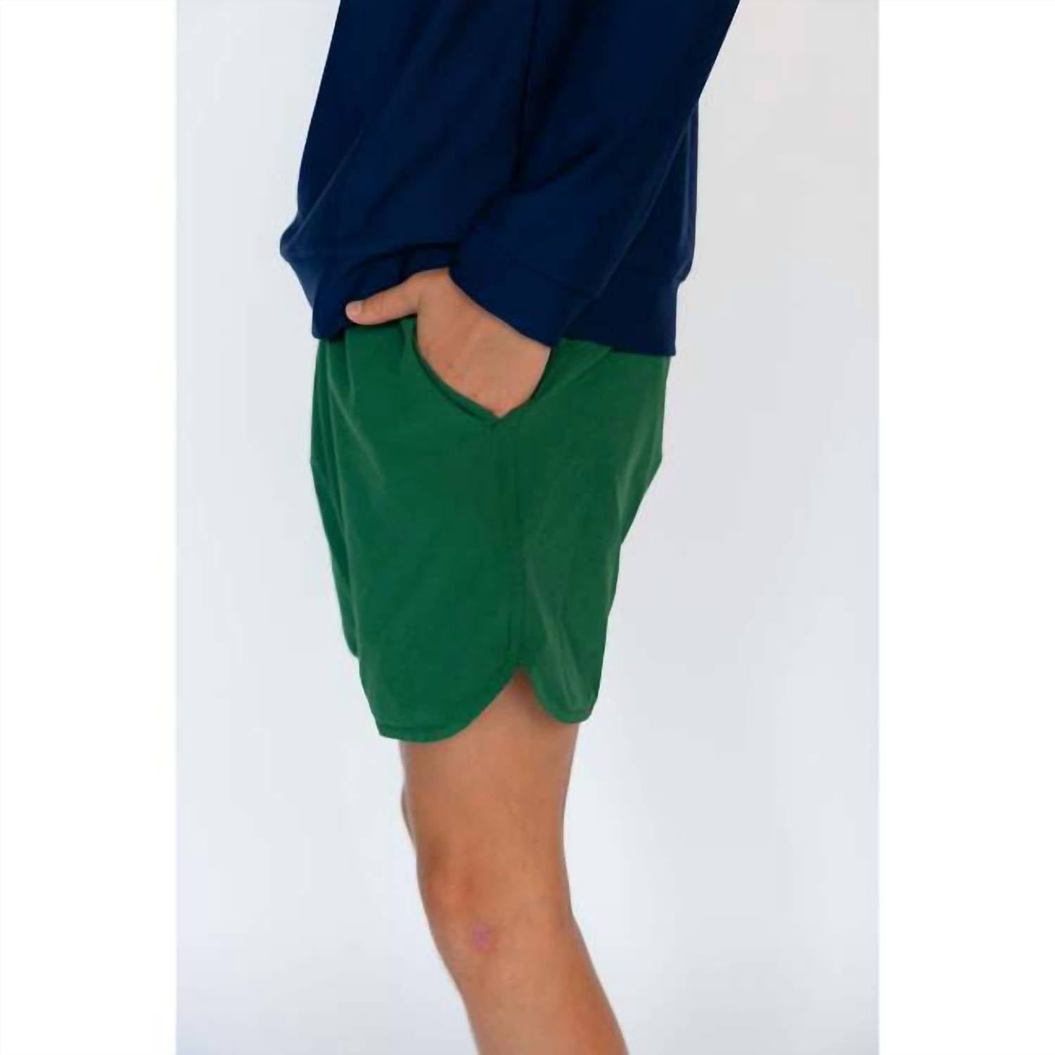 The Athletic Super Short by Courtside Kids in dark green offers a sharp modern fit designed with active boys in mind. These super shorts are crafted from custom polyester with a super soft performance fabric and four-way stretch, perfect for summer's athleisure trend. The shorts feature convenient pockets for storing various treasures and hit above the knee, appealing to both moms and boys alike. Care is easy with machine wash and tumble dry.