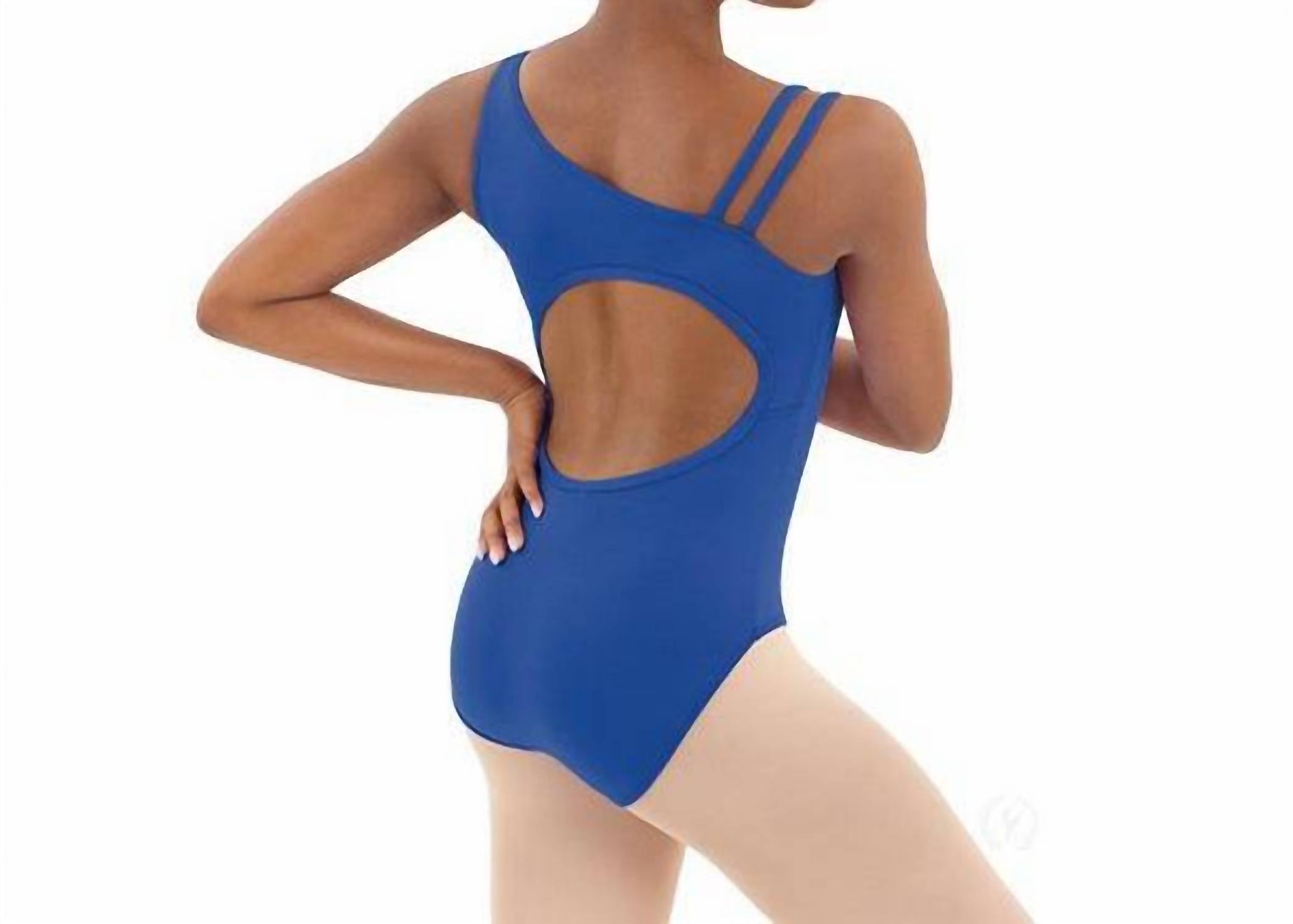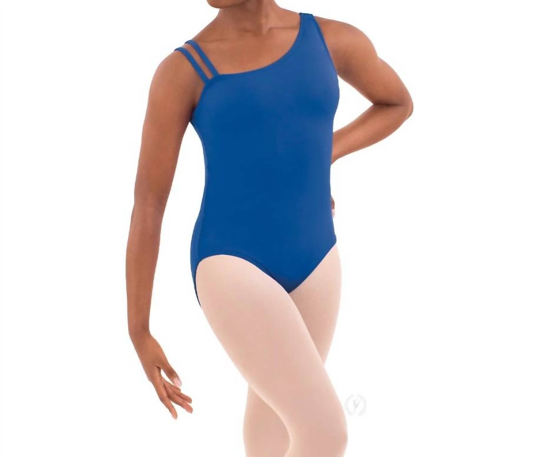 The Girls Asymmetric Leotard by Eurotard in a striking royal color is designed for active young girls. Featuring an innovative asymmetrical tank strap on the left shoulder and double camisole straps on the right, it offers both style and support. This solid-patterned bodysuit includes a full front with antimicrobial lining and an open keyhole back detail, ensuring both comfort and hygiene. Ideal for fitness and workout occasions, this leotard combines functionality with a unique design.