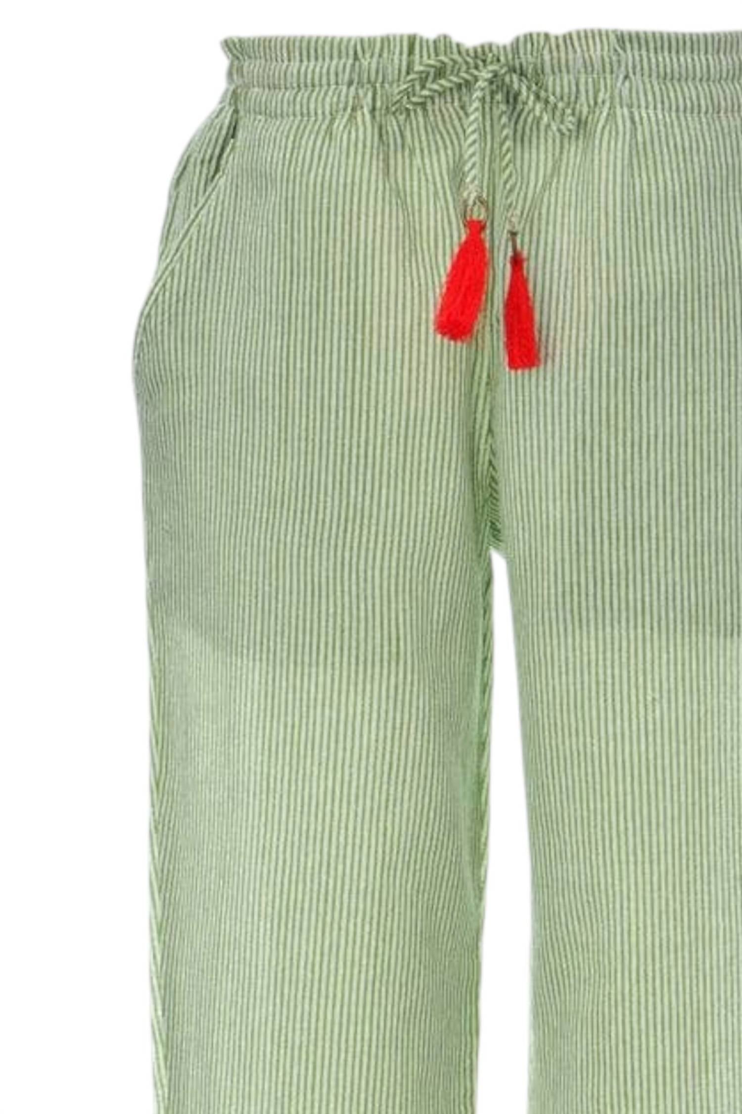 Guadalupe Design presents the Kid's Misha Pants in a lively green stripe pattern, perfect for beach days and Easter celebrations. These cotton pants feature a comfortable drawstring closure accentuated by playful red tassel details, embodying a boho chic aesthetic. Care is effortless with machine wash cold and tumble dry low, making them a practical choice for your little girl's spring wardrobe.