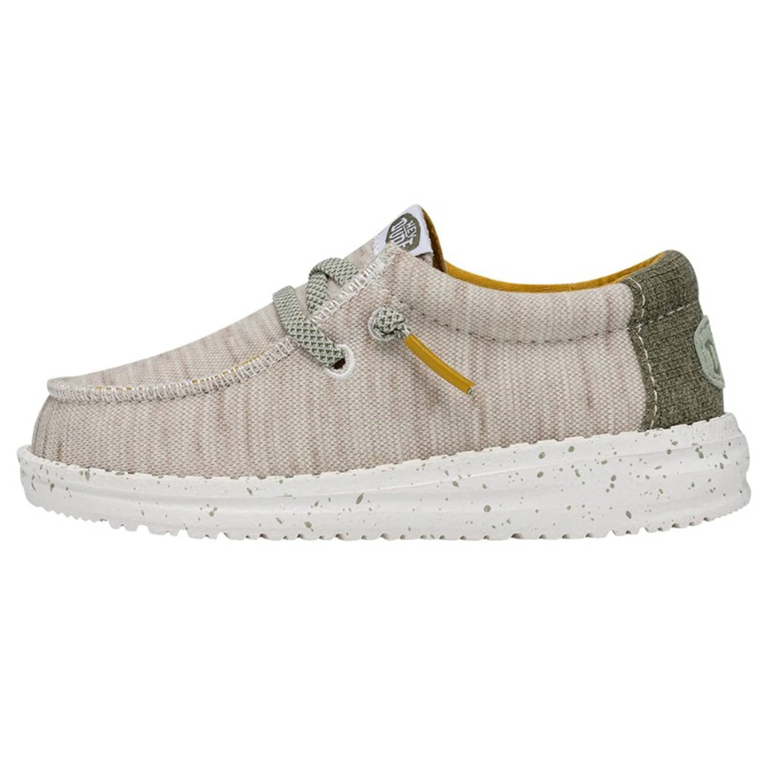 Keep your little one's feet cozy and stylish with the HEY DUDE Toddler Wally Jersey Slip On Shoes. Featuring a textile upper and elastic laces, these sneakers are perfect for active boys. The lightweight and flexible outsole ensure easy movement, while the removable foam insole adds extra comfort. Designed with a practical easy-on system and a round toe shape, these shoes are available in a versatile walnut color ideal for any playful adventure.