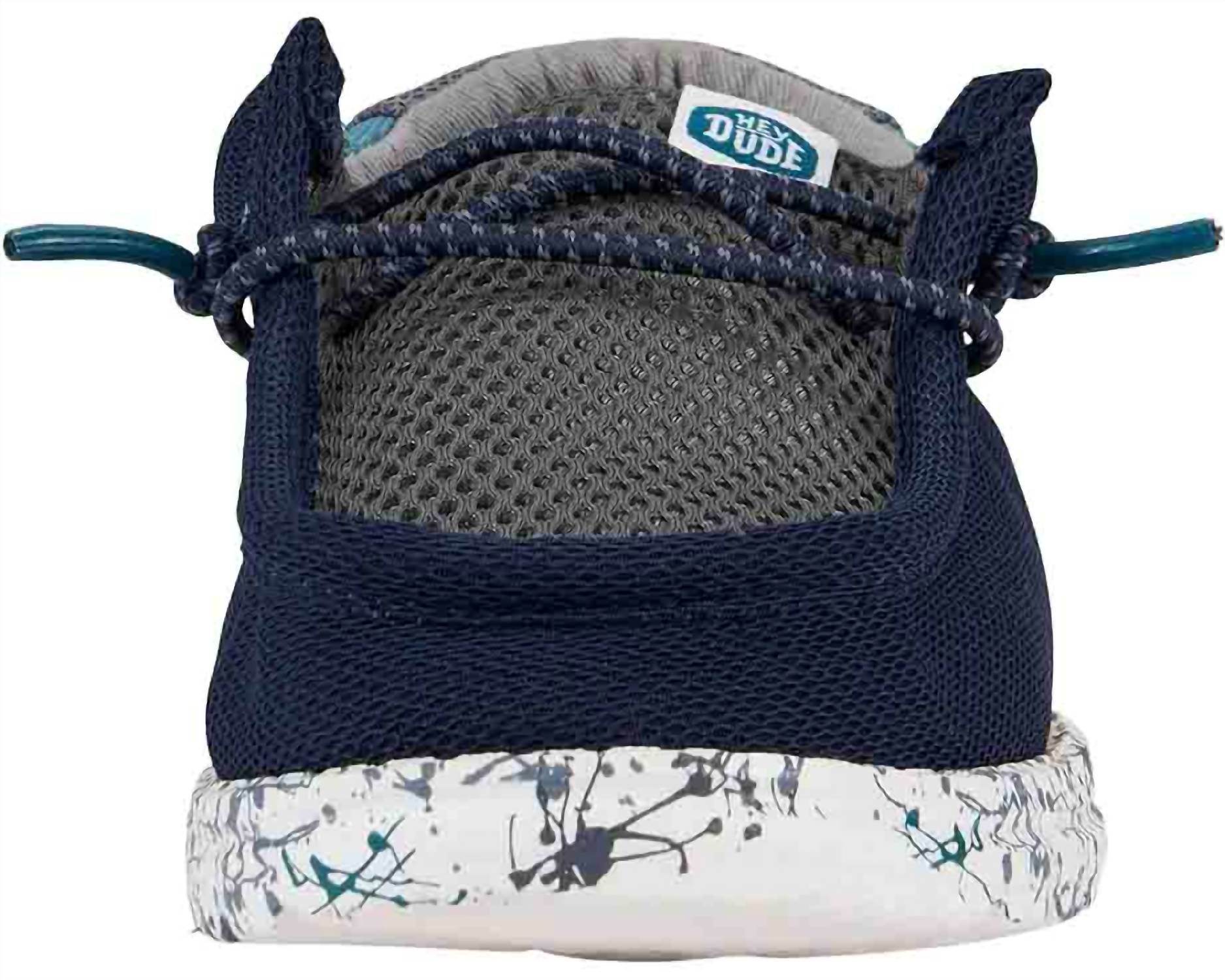 Introducing the HEY DUDE Youth Wally Summer Mesh Shoes, a stylish choice in blue and white that delivers both comfort and flair. These sneakers feature a breathable mesh fabric upper, a round toe, and a durable moc toe silhouette. Enjoy the convenience of a slip-on design with fixed laces and a printed midsole, enhanced by a textile lining and a removable Memory Foam® footbed. The ultra-lightweight and flexible flat heel outsole ensures easy movement, perfect for every active adventure.