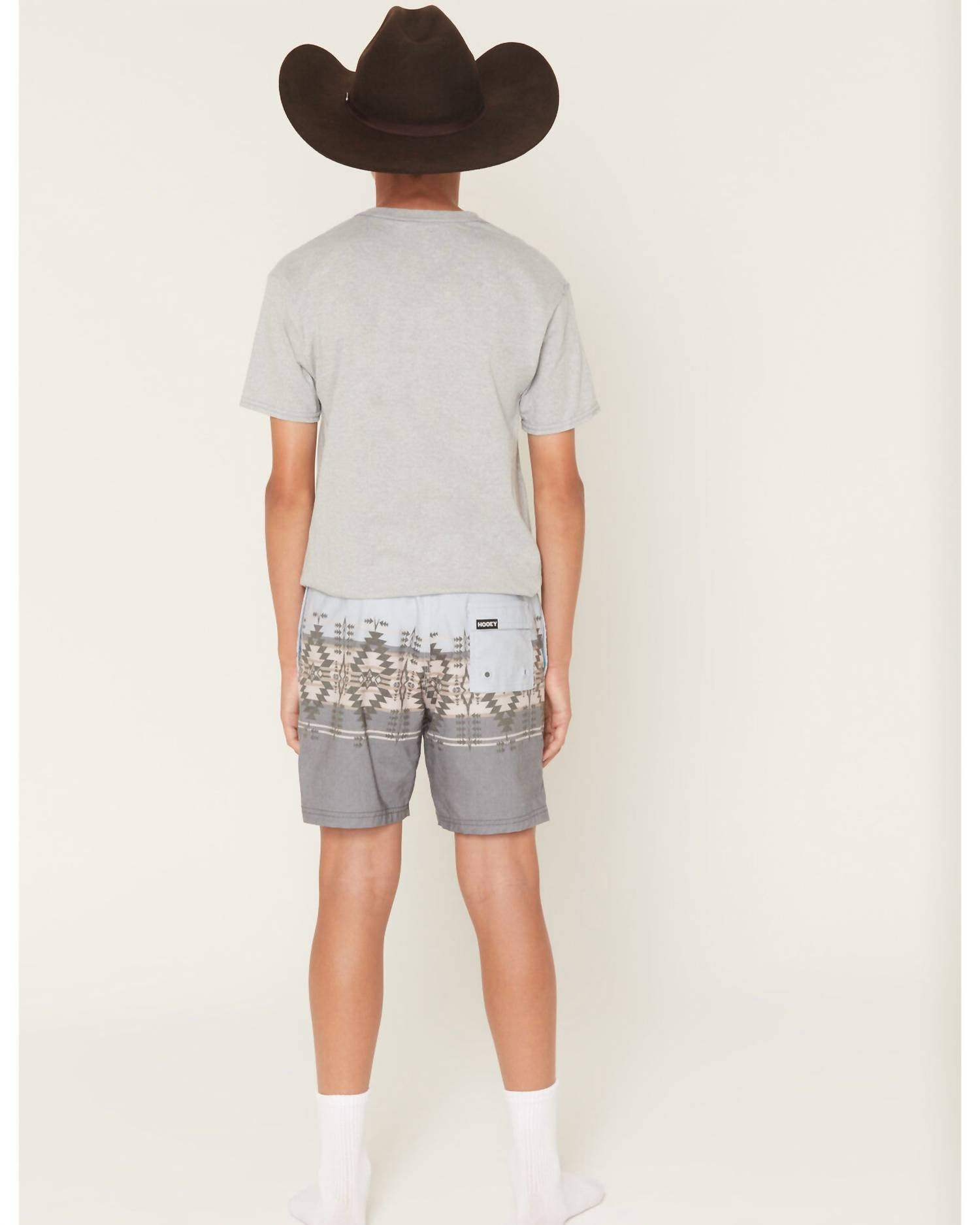 Experience summer in style with the Boy's Stripe Volley Boardshorts by HOOEY, designed to bring a splash of color to any beach day. These shorts feature a vibrant blue with gray and tan Southwestern striped pattern and a practical adjustable drawstring waist. Made from 51% cotton, 43% polyester, and 6% elastane, they include two side seam pockets and a single patch pocket on the back right with a Velcro closure. Care instructions are simple: machine wash cold and tumble dry low—perfect for your little one's adventurous spirit.