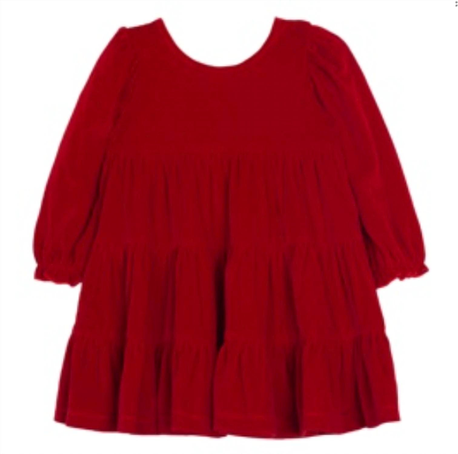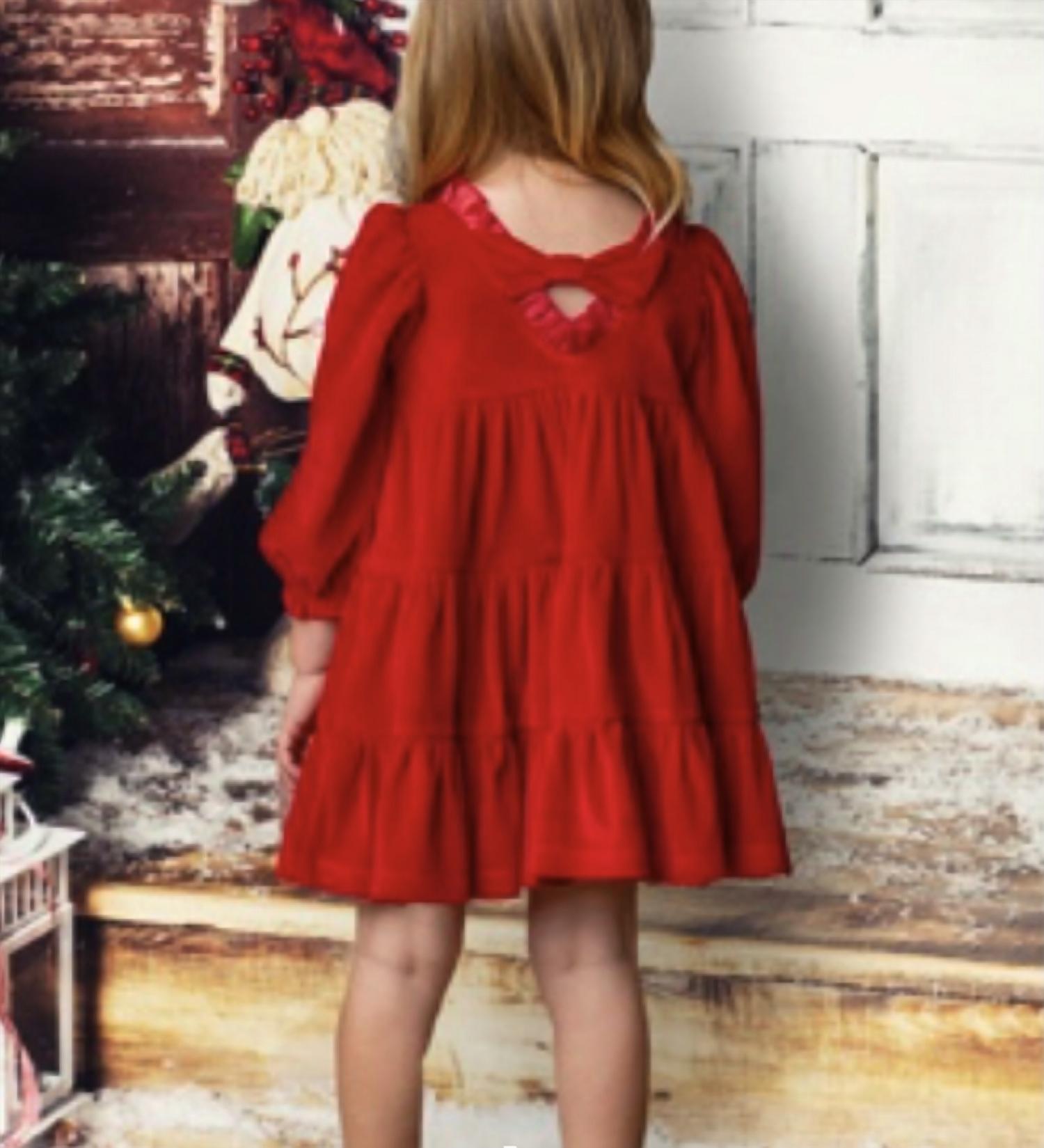 This festive holiday dress is designed in soft velvet with a three-tiered skirt that creates playful bounce and movement with every twirl. Long sleeves finish with gentle gathers at the wrists for a touch of ruffle, adding extra charm. A standout detail is the back, styled with a ruffled V-shape and a velvet bow for a sweet, elegant finish. Perfect for holiday photos, family gatherings, and sibling outfit pairings.