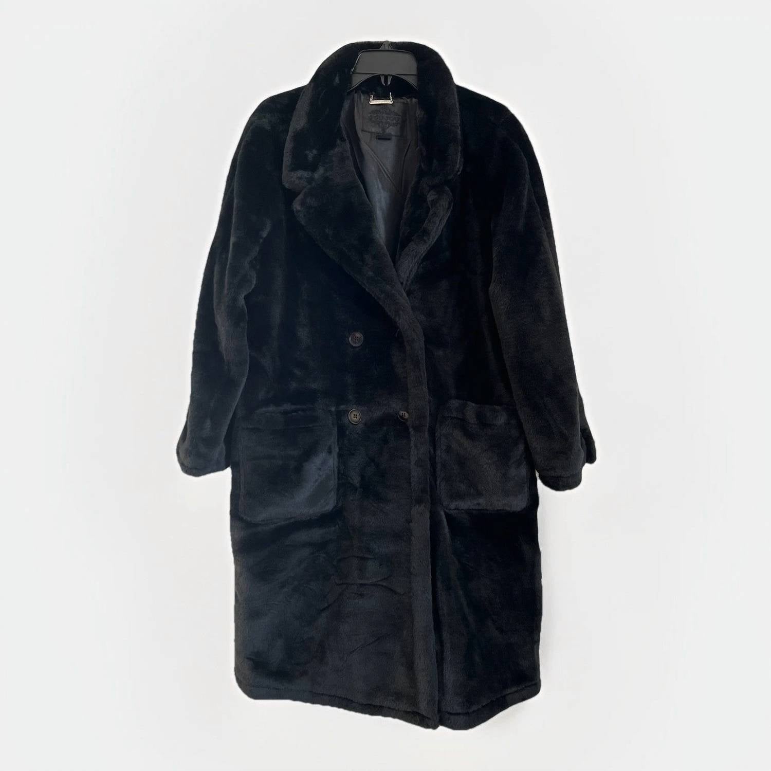 Stay warm and stylish with the Juniors Faux Fur Double Breasted Coat by Joujou, a luxurious addition to your winter wardrobe. This garment showcases a notched collar and long sleeves for a sophisticated look, complemented by front double-breasted button closures. Made from plush polyester, it features two self-drop pockets at the front. Care instructions recommend spot or wipe cleaning to maintain its fresh appearance.