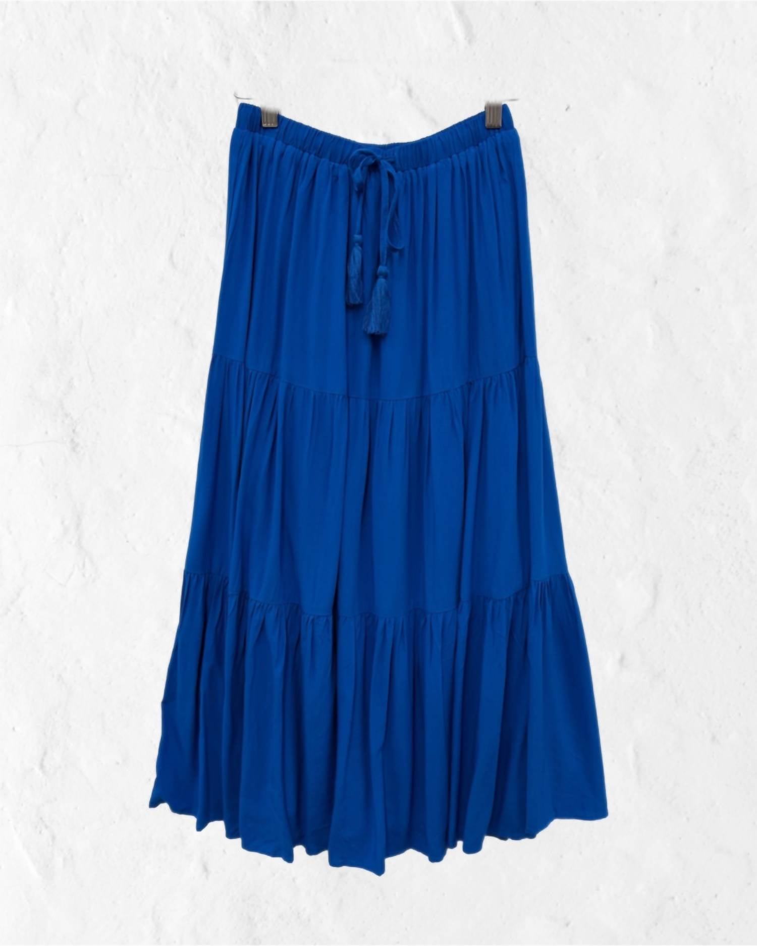 Who doesn't love a good maxi skirt? Elevate your summer travel style with the Junior Adult Esme Maxi Skirt by Katie J NYC in Mykonos Blue. This women's skirt is designed with a flattering tiered silhouette that complements its maxi length, providing both elegance and movement. With a solid pattern, it features a convenient pull-on closure for easy wear. Perfect for 90s fashion enthusiasts, this piece is an ideal choice for Fourth of July festivities.