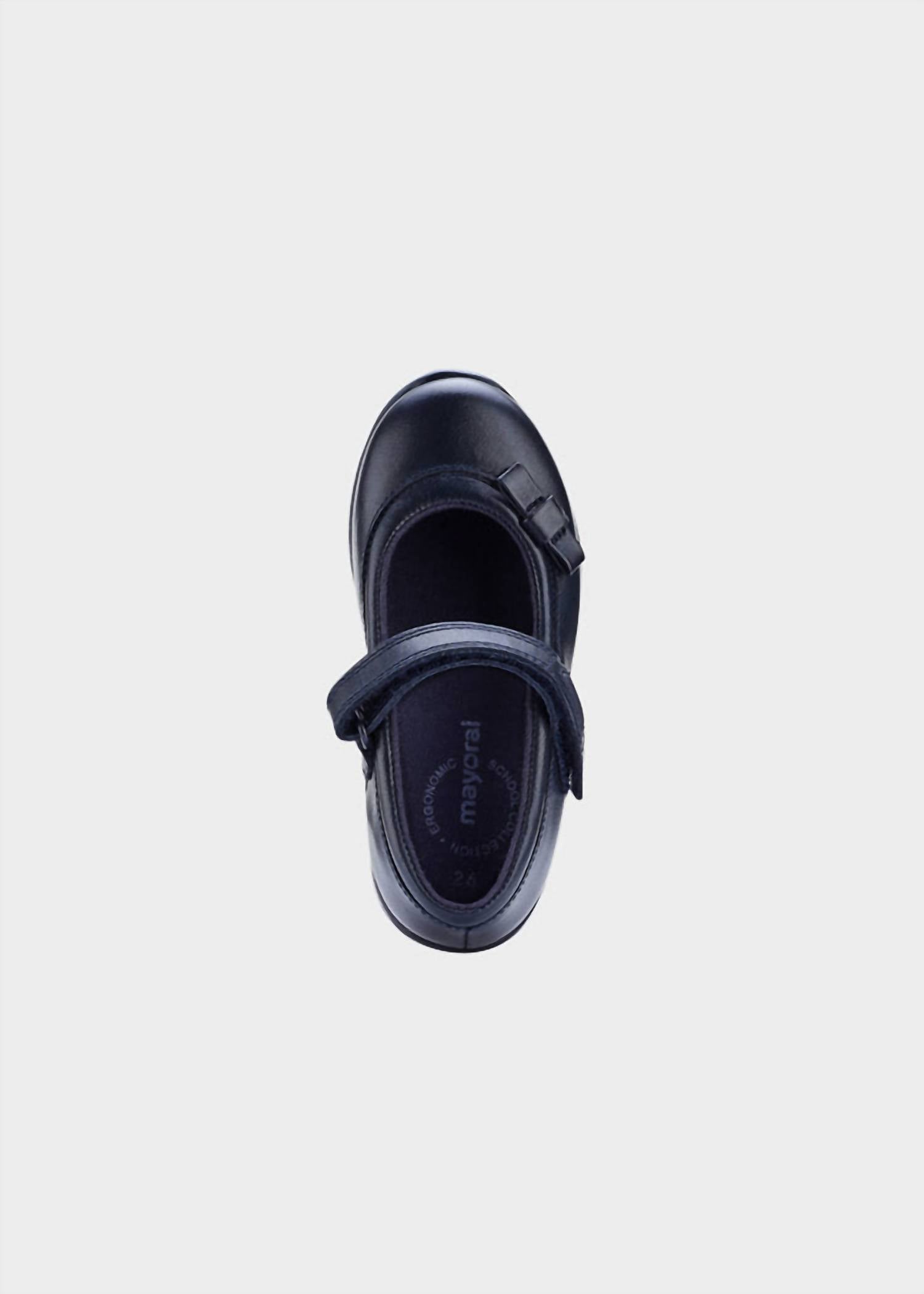 Introducing the Kid's Matte School Shoe by Mayoral, crafted in navy blue genuine leather for both style and comfort. This girl's shoe features an adjustable velcro ankle strap with a chic leather bow accent, ideal for little kids navigating their busy day. The interior showcases a breathable mix of 52% polyester and 48% cotton, while the flexible, non-slip 100% thermoplastic rubber sole ensures stability and ease of wear. Perfect for holiday parties or everyday school attire, this flat shoe with a round toe is sure to become a summer favorite.