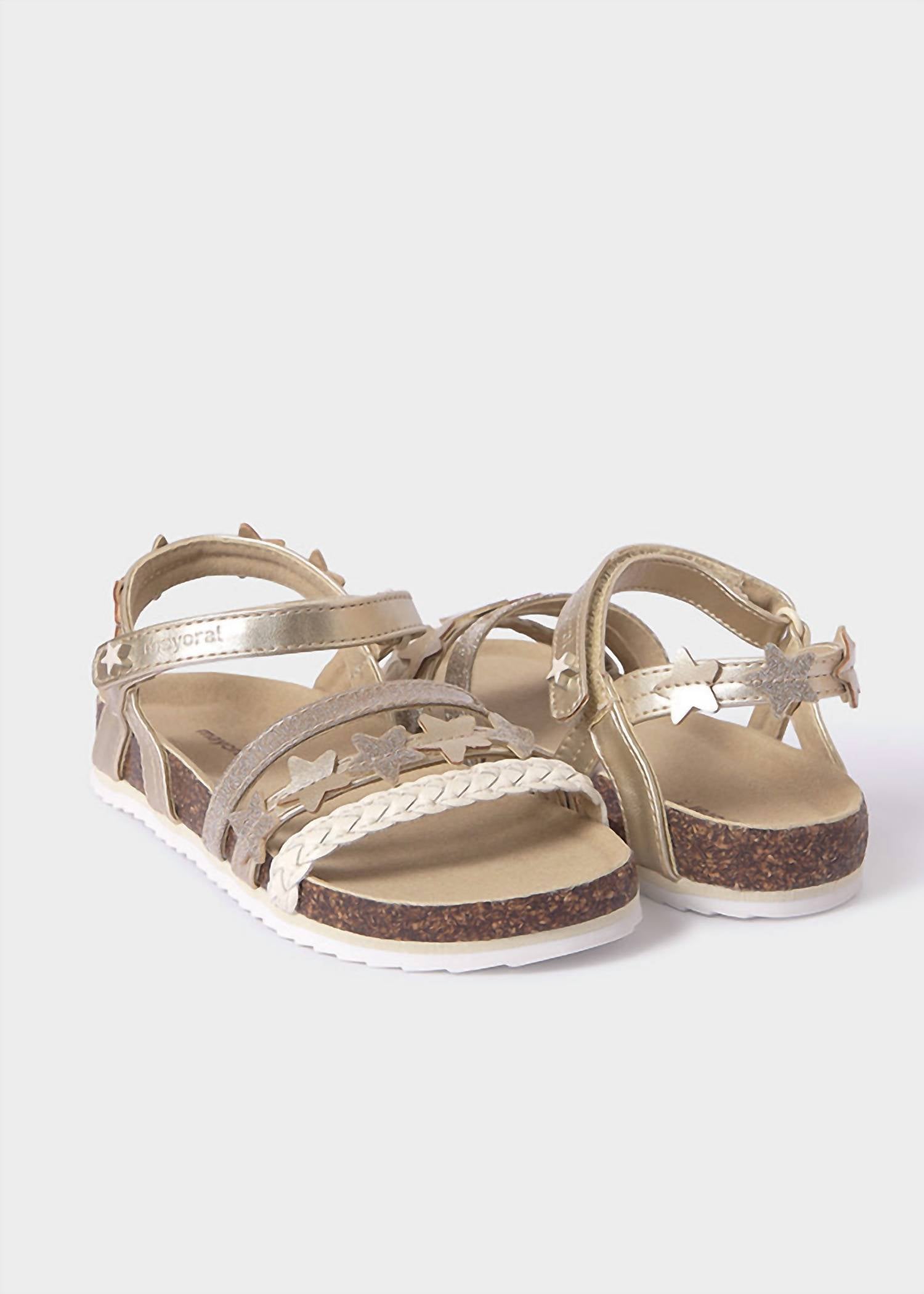 Introduce your little one to style with the Toddler Star Design Sandals by Mayoral, perfect for summer adventures. These adorable gold sandals feature an open toe design with a flat heel, ideal for a vacation or a day of streetwear fashion. Designed with toddlers in mind, they provide comfort while making a stylish statement. Let your girl sparkle and shine with these must-have sandals.