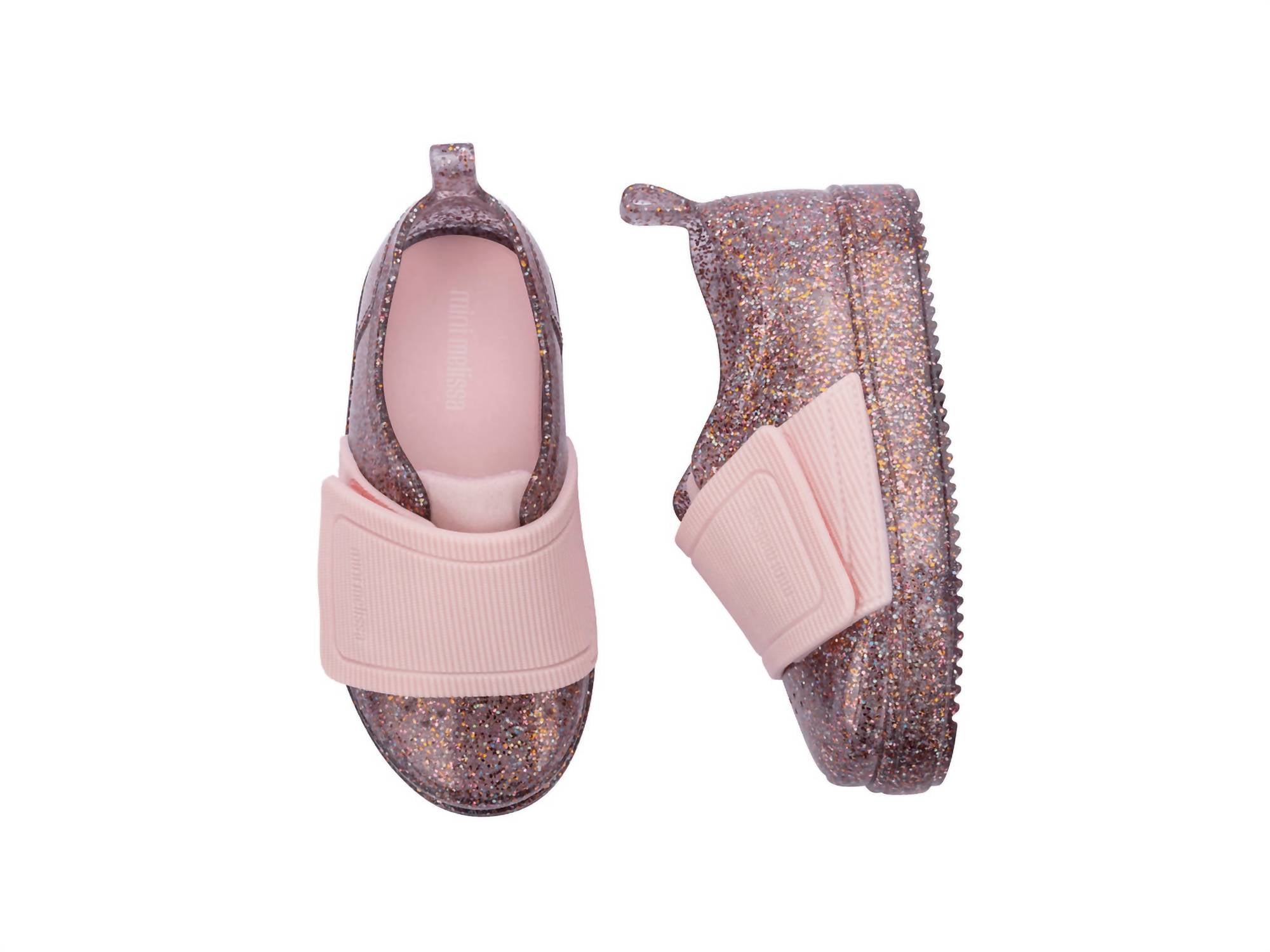 The Mini Melissa Jelly Pop sneaker is full of playfulness, color, and Melissa. Combining a sporty aesthetic with Melissa's fashion-forward DNA, this model has a super comfy, fluffy insole and easy-to-use Velcro closure, allowing your mini to jump and play safely and comfortably.