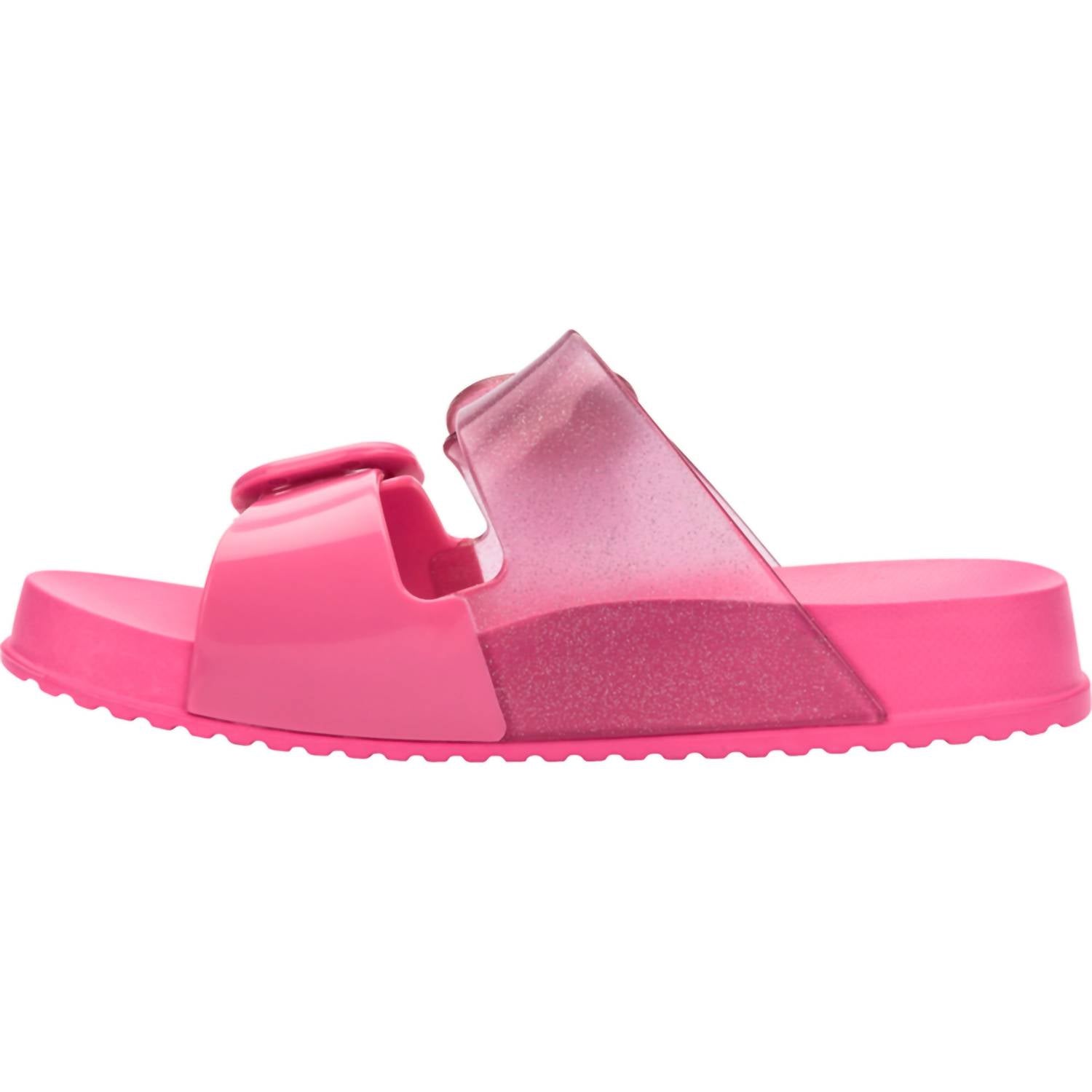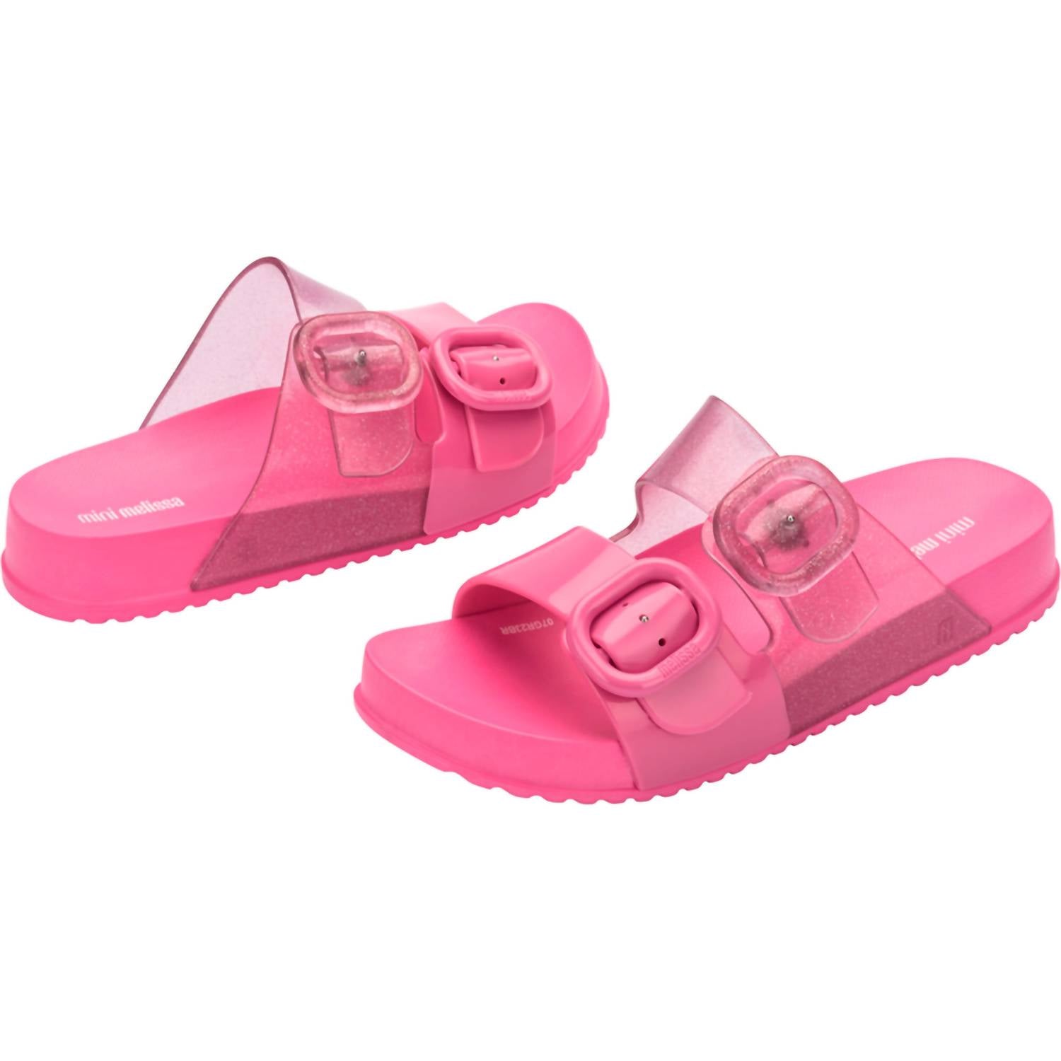 Introducing the Kids Cozy Double Strap Slides by Mini Melissa, designed for little fashionistas who want playful style with unmatched comfort. These slides are crafted with an easy-to-wear design featuring a trendy double-buckle accent. Composition includes an upper made of 98% PVC and 2% metal, paired with a sole of 100% EVA for a comfy fit. Hand wash with warm water and mild soap, then air dry away from the sun. Enjoy the charming bubblegum scent and round toe shape, perfect for unisex wear in classic Pink.