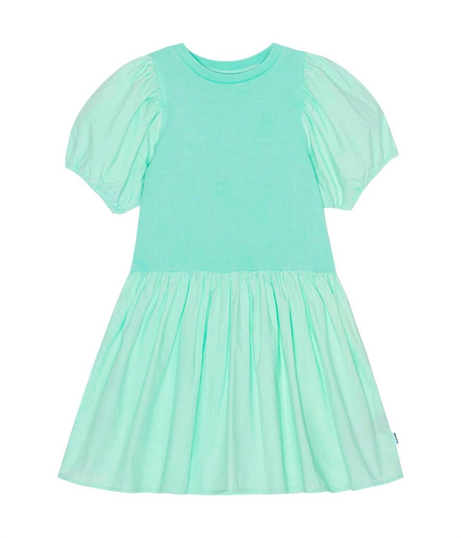 This knee-length dress features a playful print of a clover on the chest, made from soft organic cotton in a refreshing mint green color. The top has a round neck and elastic, full short sleeves, while the skirt is gathered at the waist for a flattering silhouette. 100% Organic cotton. Iron at low heat. Do not iron directly on print. Do not tumble dry. Do not bleach. Do not dry clean. Do not use softener. Gentle wash at 30 degrees. Wash and iron inside out. Wash separately.