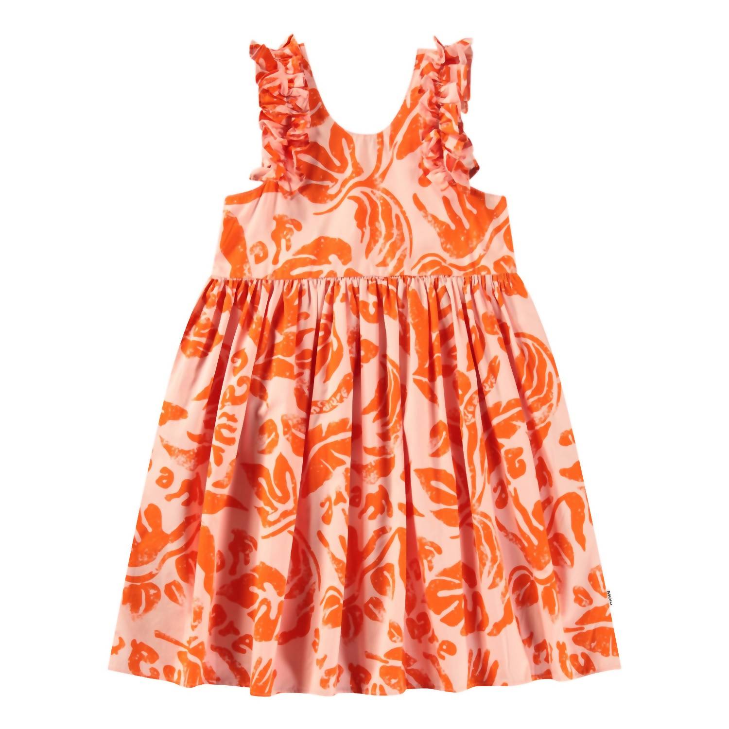 The Girl's Cicely Dress by Molo is a charming knee-length piece perfect for summer vacations. Featuring sleeveless ruffle edges, this dress is crafted from 100% organic cotton and showcases an orange print with leaves and the phrase "We are nature." It's designed in a loose fit with a V-neckline at the back for added style. Care instructions: Machine wash.