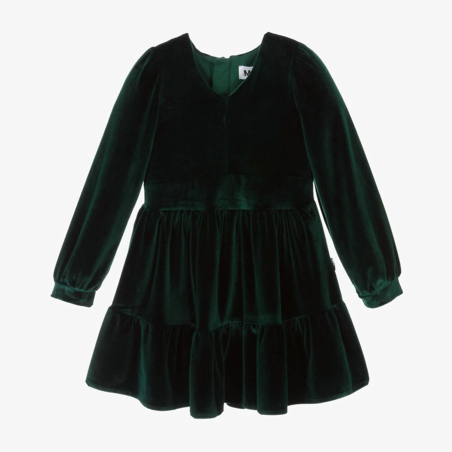 Elegant choice in a rich emerald green perfect for holiday parties. Features puffed sleeves and a deep frill around the hemline. Crafted from 94% polyester and 6% elastane, offering a soft, stretchy velour fabric. On-the-knee length and a discreet side zip closure for ease of wear. Care instructions include machine washing at 30°C, ensuring hassle-free maintenance for repeated wear.