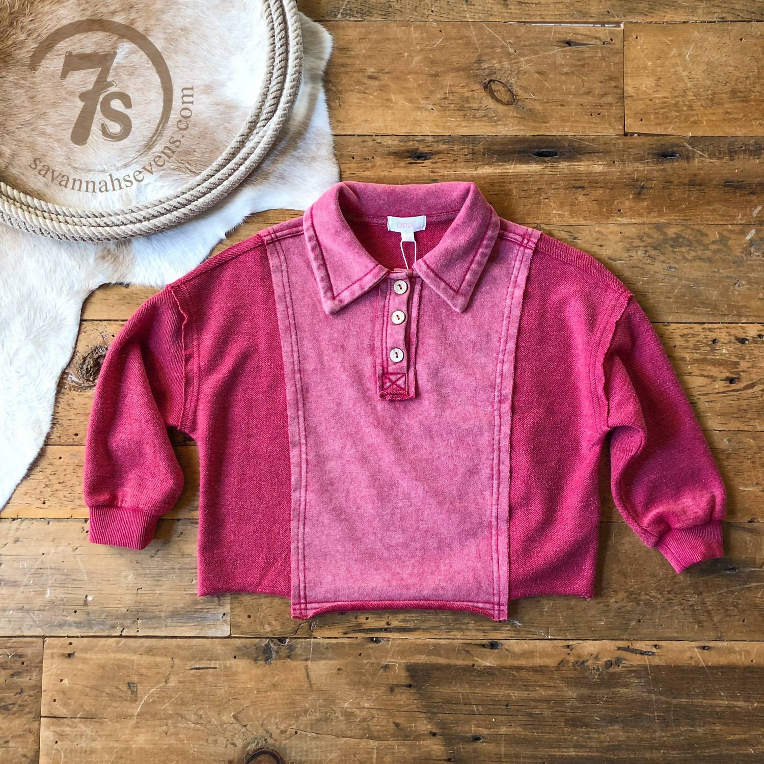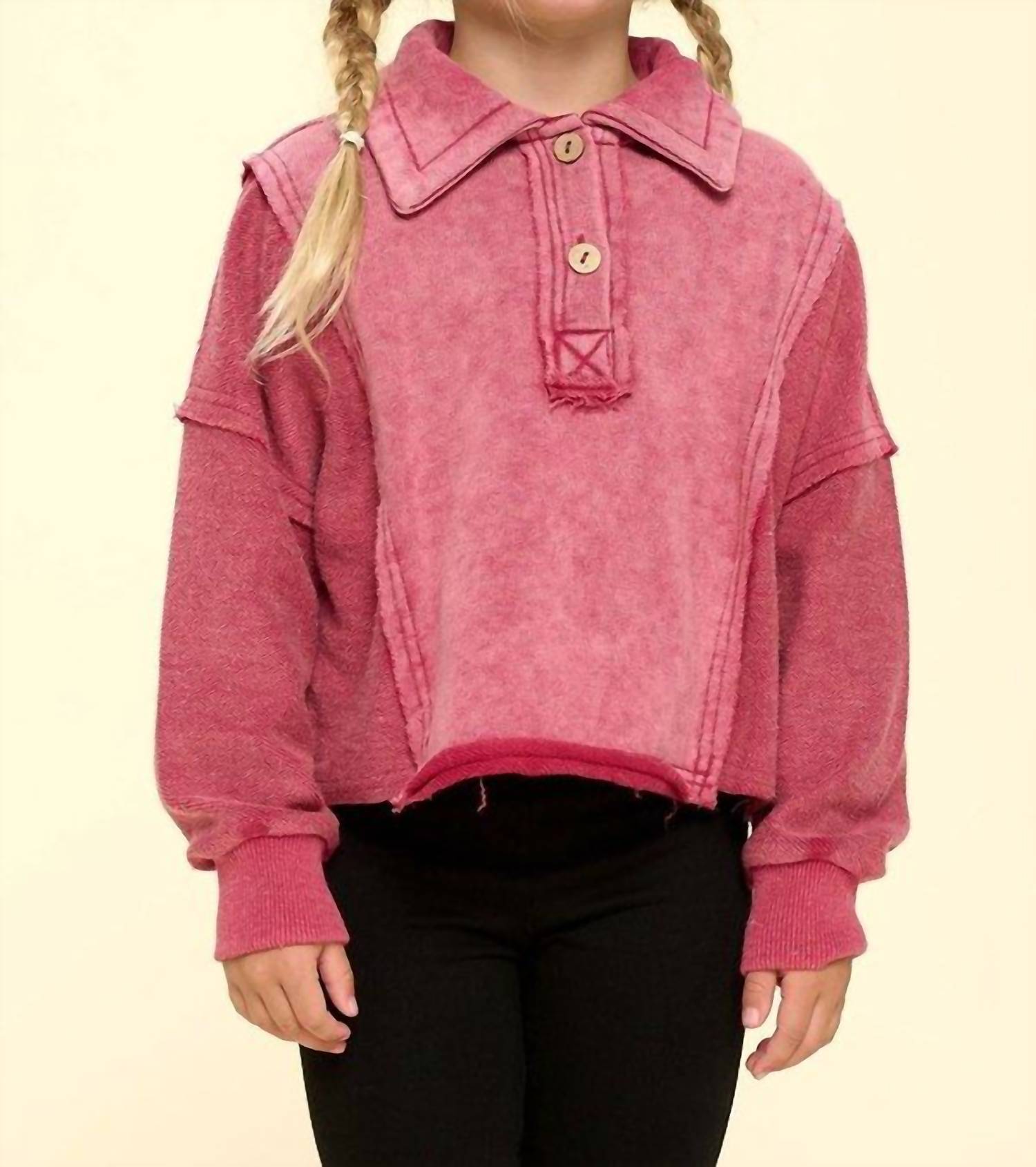 Color washed magenta youth pullover. Drop shoulder. Cork button detail. Exposed raw seams. Ribbed cuff. Soft cotton blend terry cloth and sweatshirt material. Relaxed comfy fit. Fits true to standard youth sizing.