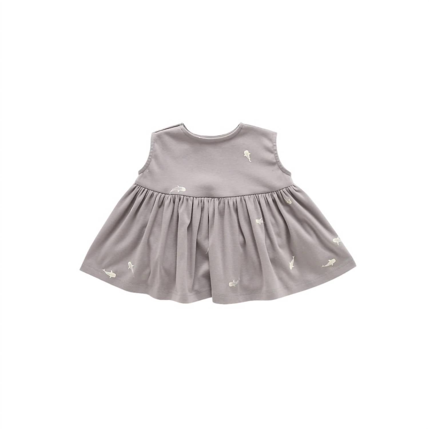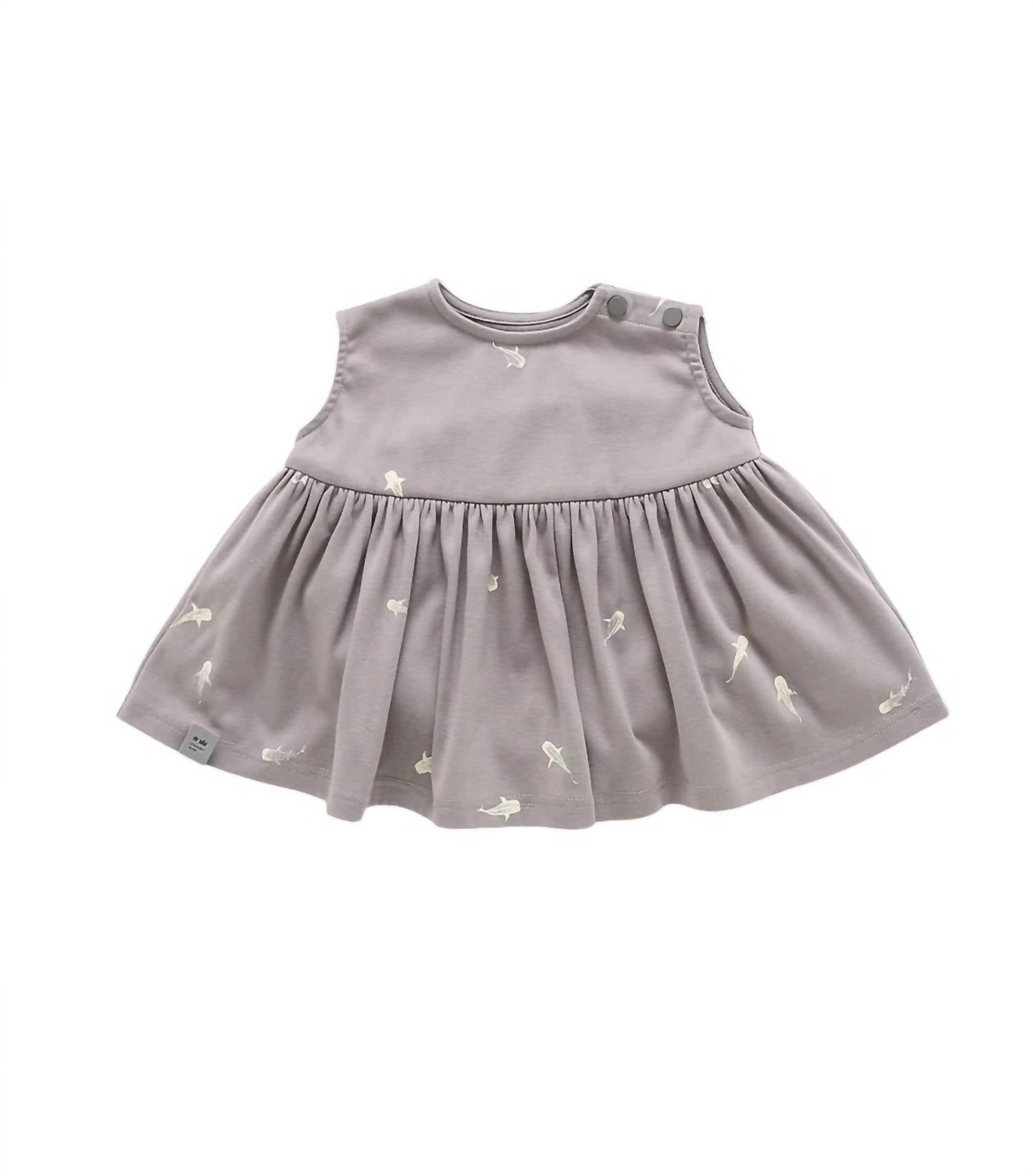 Tiny whale sharks print and a super soft, brushed jersey fabric. Fit and flare silhouette with generously shirred skirt is perfect for a special event or family pictures but also comfortable enough for everyday adventures. Shoulder snap opening. Faux suede logo label detail. Elasticized waist. 100% cotton.
