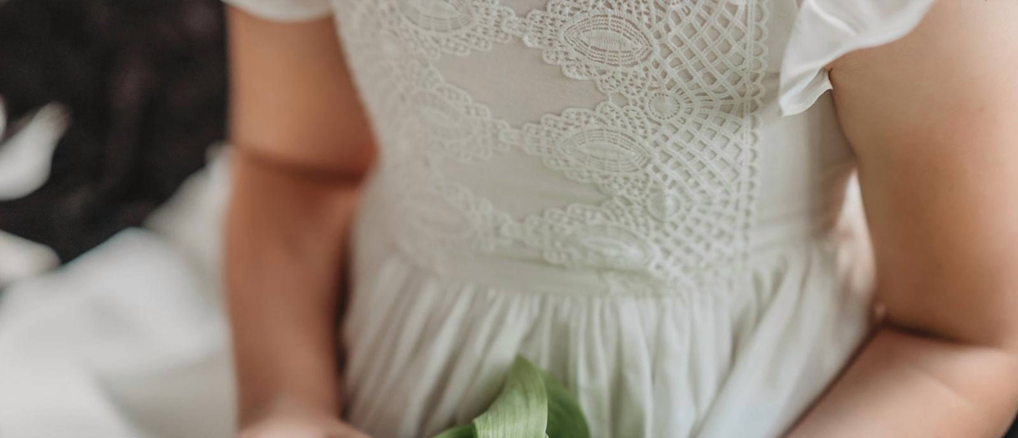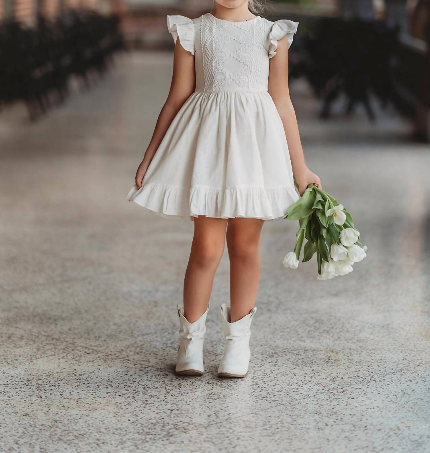 Introducing the Ethel Fancy Pinafore Dress by Only Little Once, a sophisticated and charming addition to any formal occasion wardrobe. Made from high-quality woven cotton, this soft white dress features elegant cotton lace bodice and flutter sleeve details for a vintage appeal. Perfect for weddings, Easter, and special spring events, its versatility is ideal for everything from family beach photos to flower girl duties. Our model is 53" tall and weighs 68 lbs, showcasing the dress in size 8, with the option to add a pettiskirt for extra fullness, sold separately.