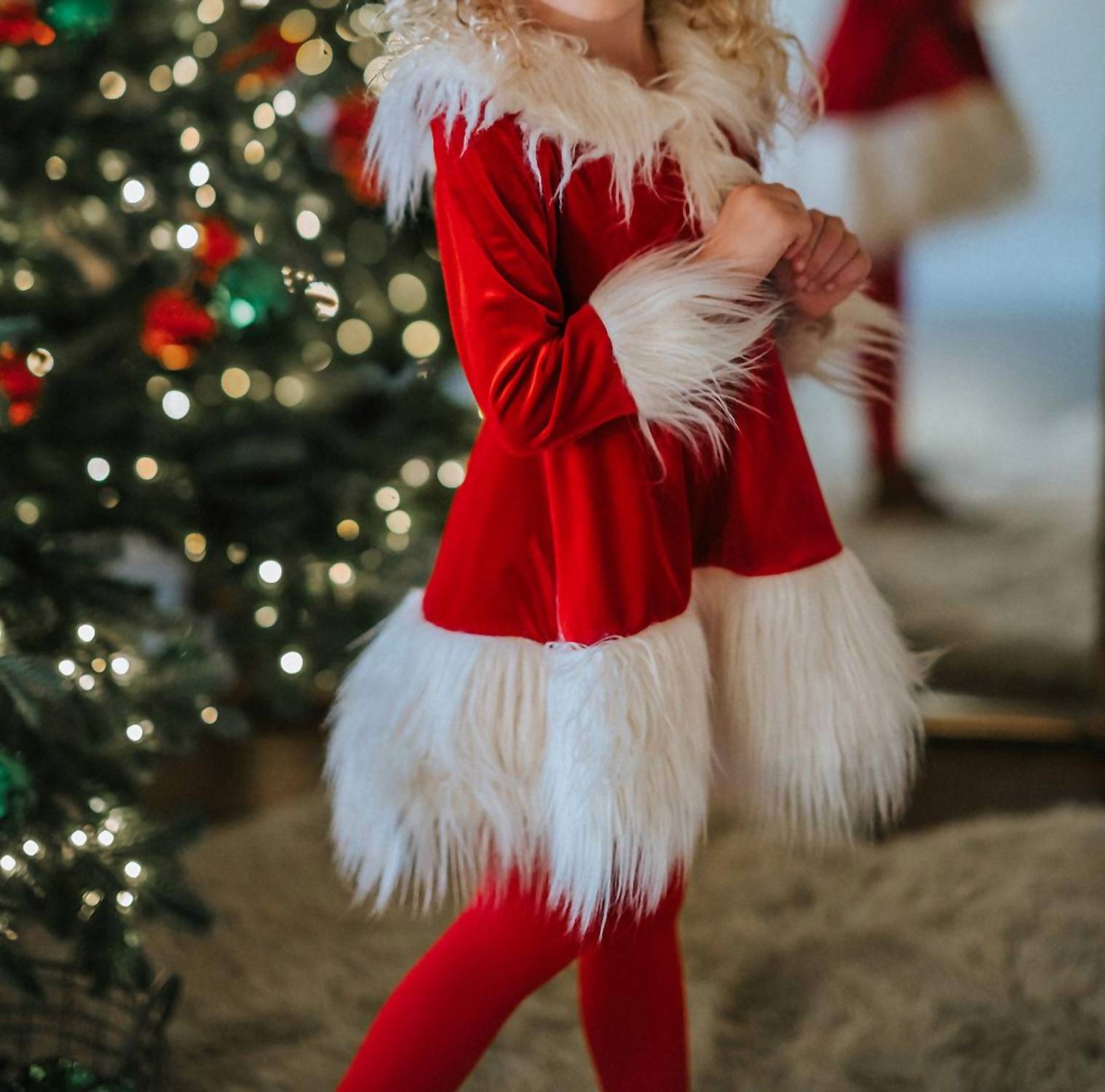 Step into the holiday spirit with the Martha Santa Claus Dress by Only Little Once, an exquisite piece for festive celebrations. This glamorous dress is crafted from soft red velvet and features high pile ivory faux fur, echoing the elegance of a fashion icon. Complemented by a sewn-on black belt with a buckle that ties as a sash at the back, it brings a chic twist to holiday parties. Ideal for winter wear, this solid pattern dress is perfect for any Christmas occasion. Model is wearing a size 5, approximately 47.5” tall and 46 lbs.